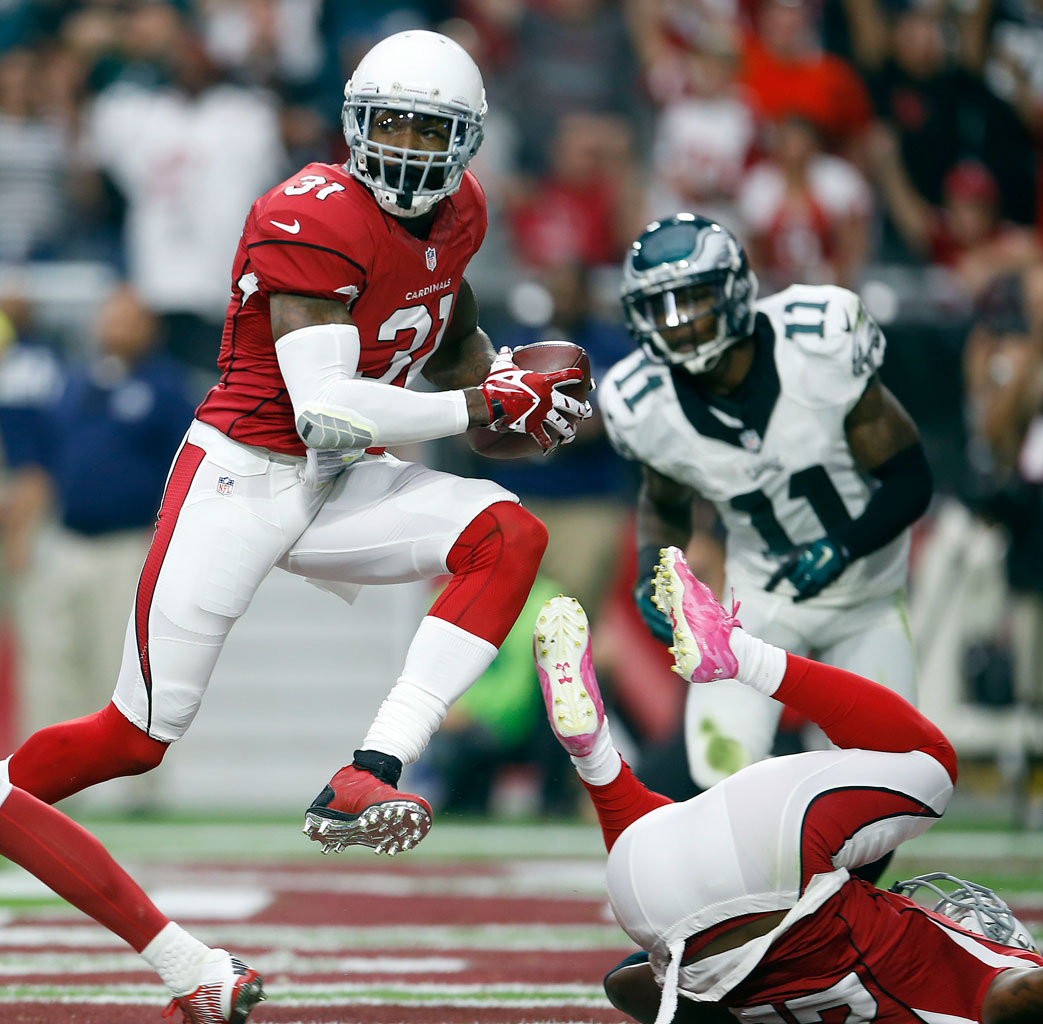Antonio Cromartie of the Cardinals intercepts a pass against the Eagles on Oct. 26, 2014.