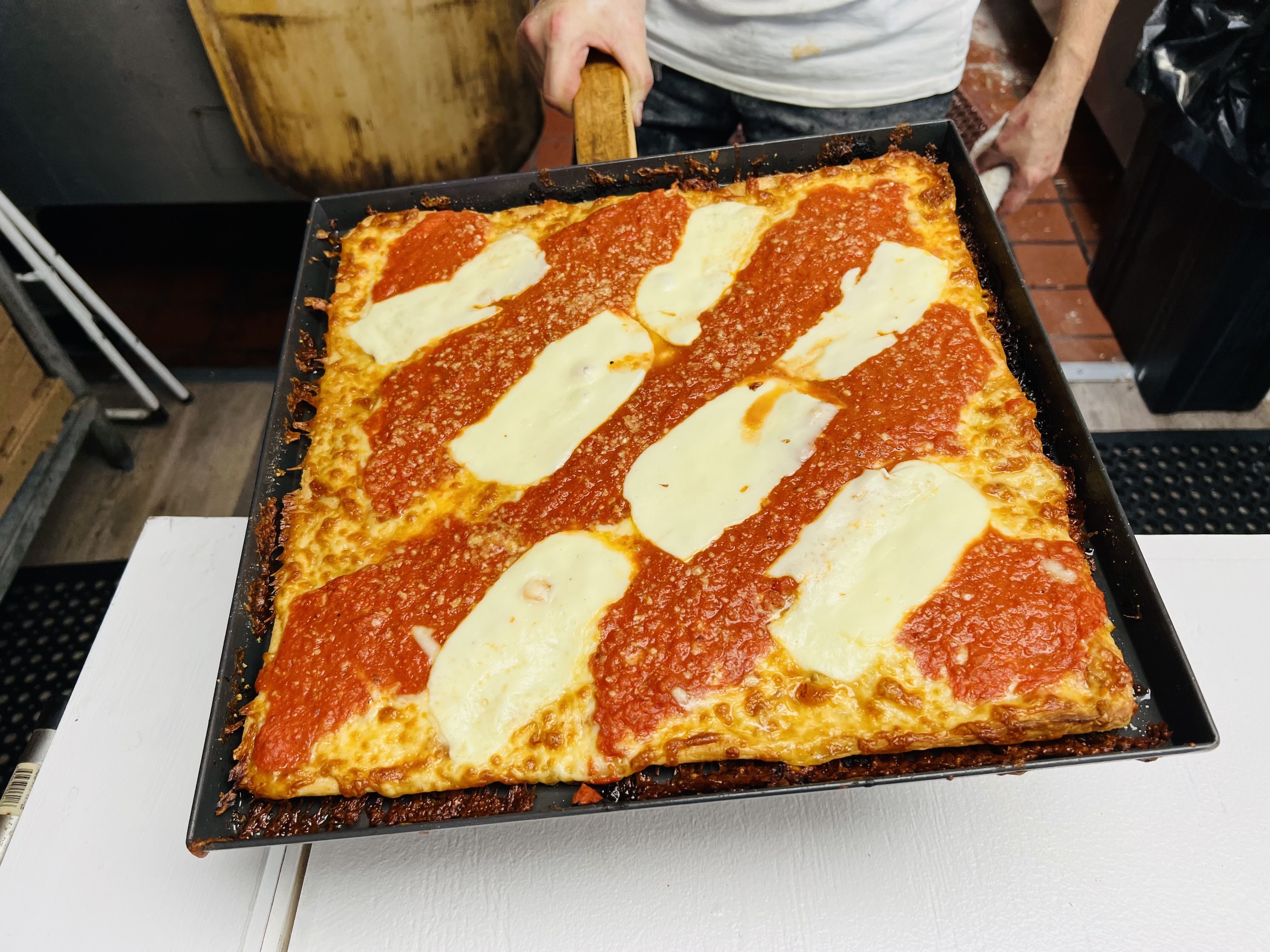 Deena Fink and Frank Innusa traded careers in show biz to entertain on an entirely different stage: a slice shop across from the Fort Washington Regional Rail station. Their drunken grandma pie is a thing of beauty: a crispy, almost buttery-bottomed square topped with fresh mozzarella and ribboned with a thick, creamy vodka sauce amped with pancetta. Read on for their story.
