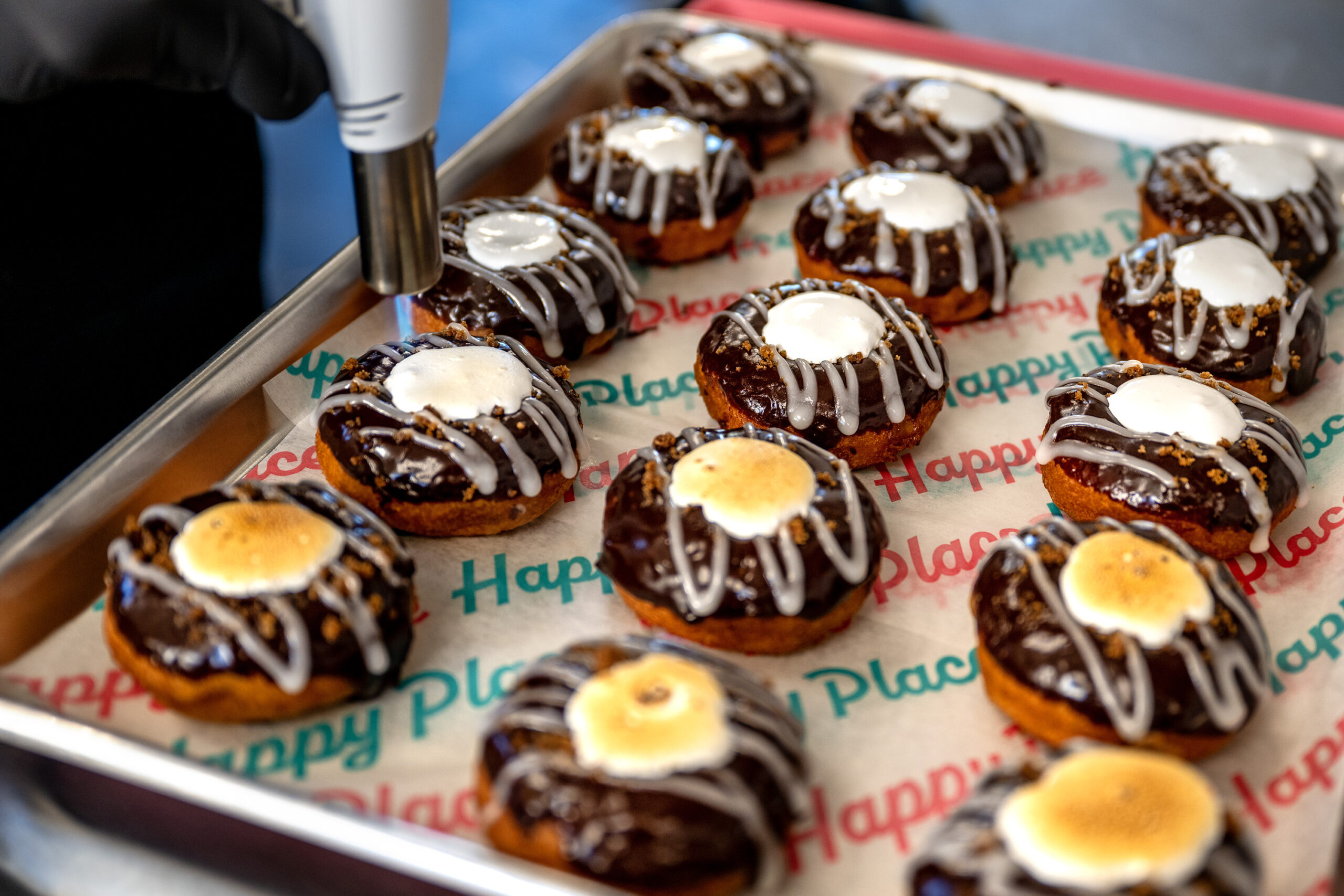 A torch is used to toast the marshmallow atop the s’mores doughnuts at Happy Place Homemade.
