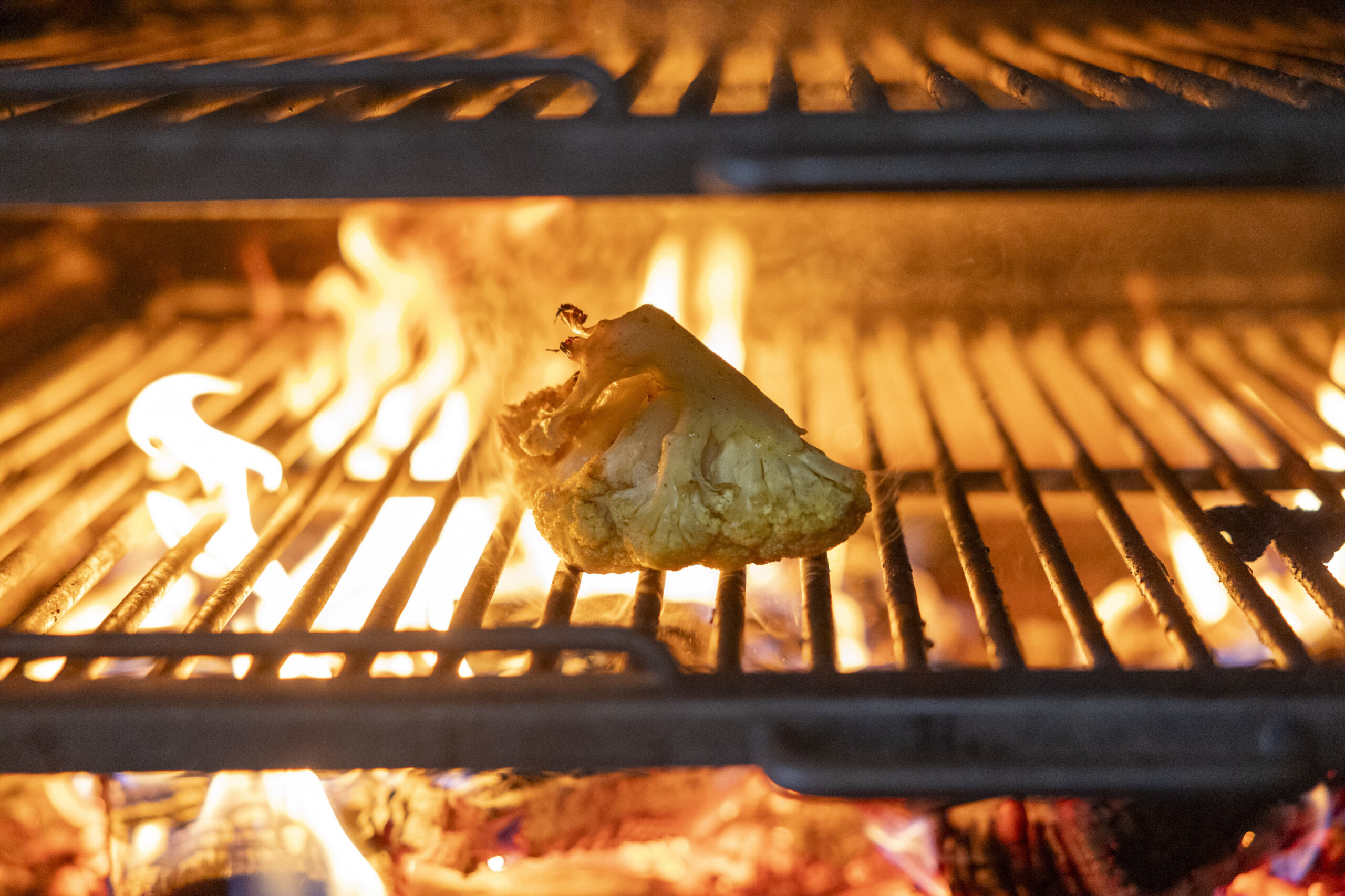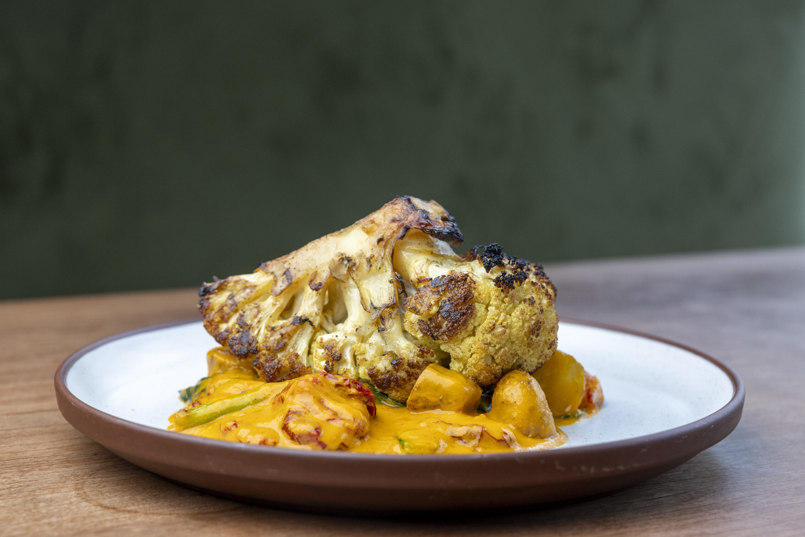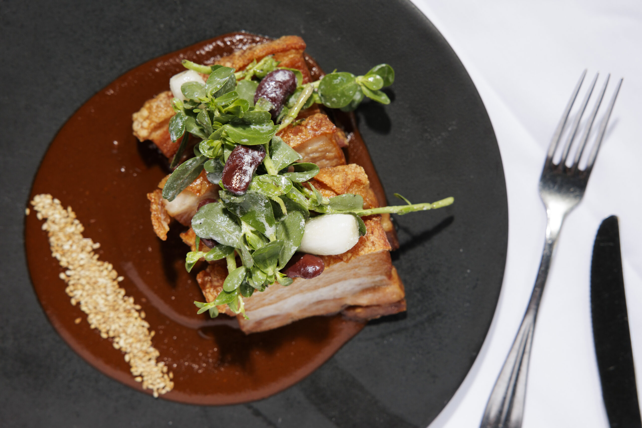 Sabatino’s talent with vegetables is also on full display, with half-moons of deeply caramelized onion tarte Tatin enriched with Gruyère and more of that corn miso (made for Sabatino by Timothy Dearing of the Ule supper club). Roasted rounds of sumac-cured sweet potatoes are encrusted with sunflower seeds drizzled in a sauce gribiche. Grilled caraflex cabbage is served “à l’orange” with pickled green tomatoes, preserved ginger relish, spiced peanuts, and herbs.