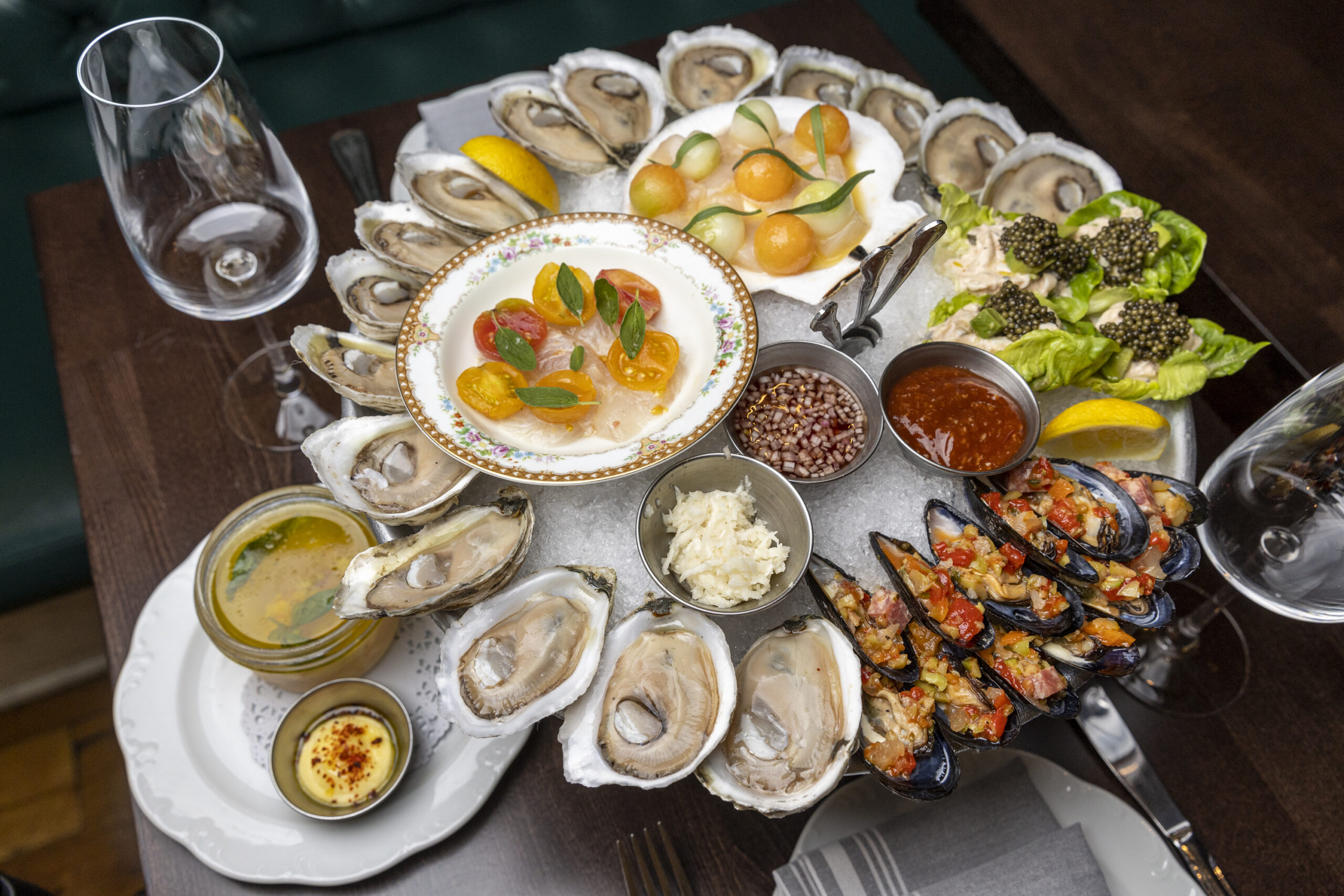 Large seafood plateau with shrimp cocktail, clams ceviche with peach and jalapeño, three types of oysters, scallop crudo with melon water, and bluefin tuna with corn vinaigrette. Sauces are cilantro tarragon aioli and rosé mignonette, at Tesiny.