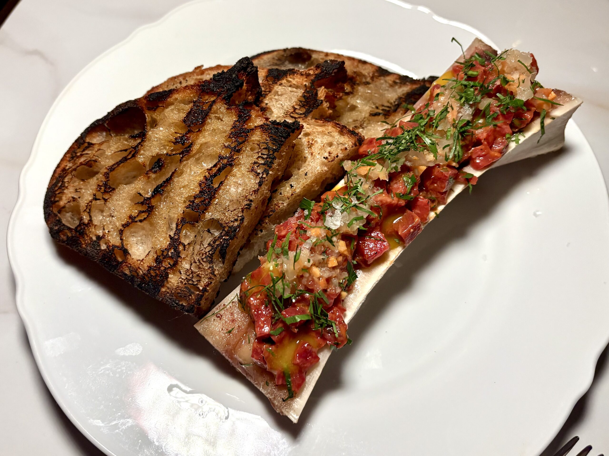 Beef tartare is served over roasted bone marrow at Fleur’s in Kensington.