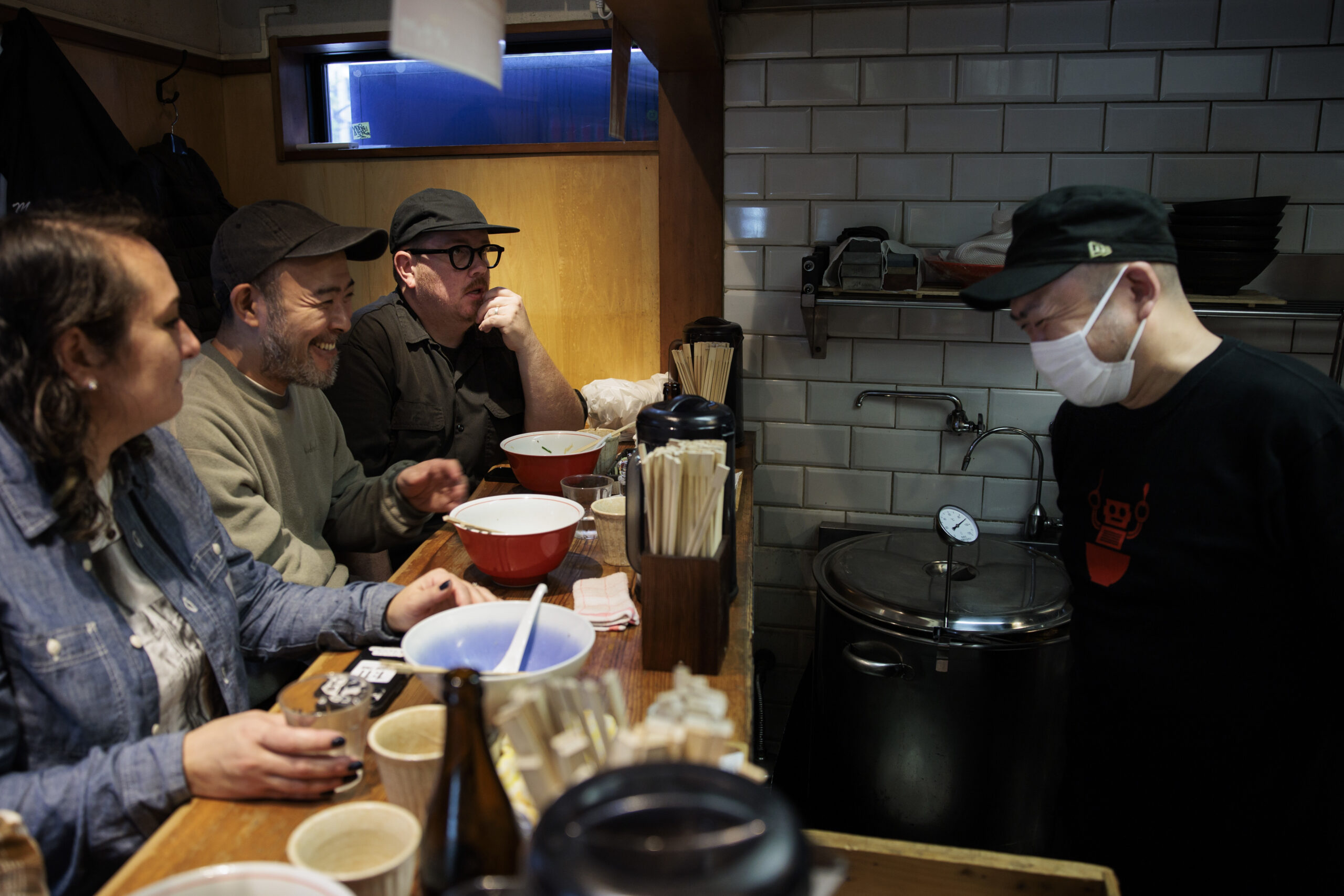 Lindsay Mariko Steigerwald (from left), Jesse Pryor, and Jesse Ito sit at the counter at Ramen Ichifuku in November in Tokyo.