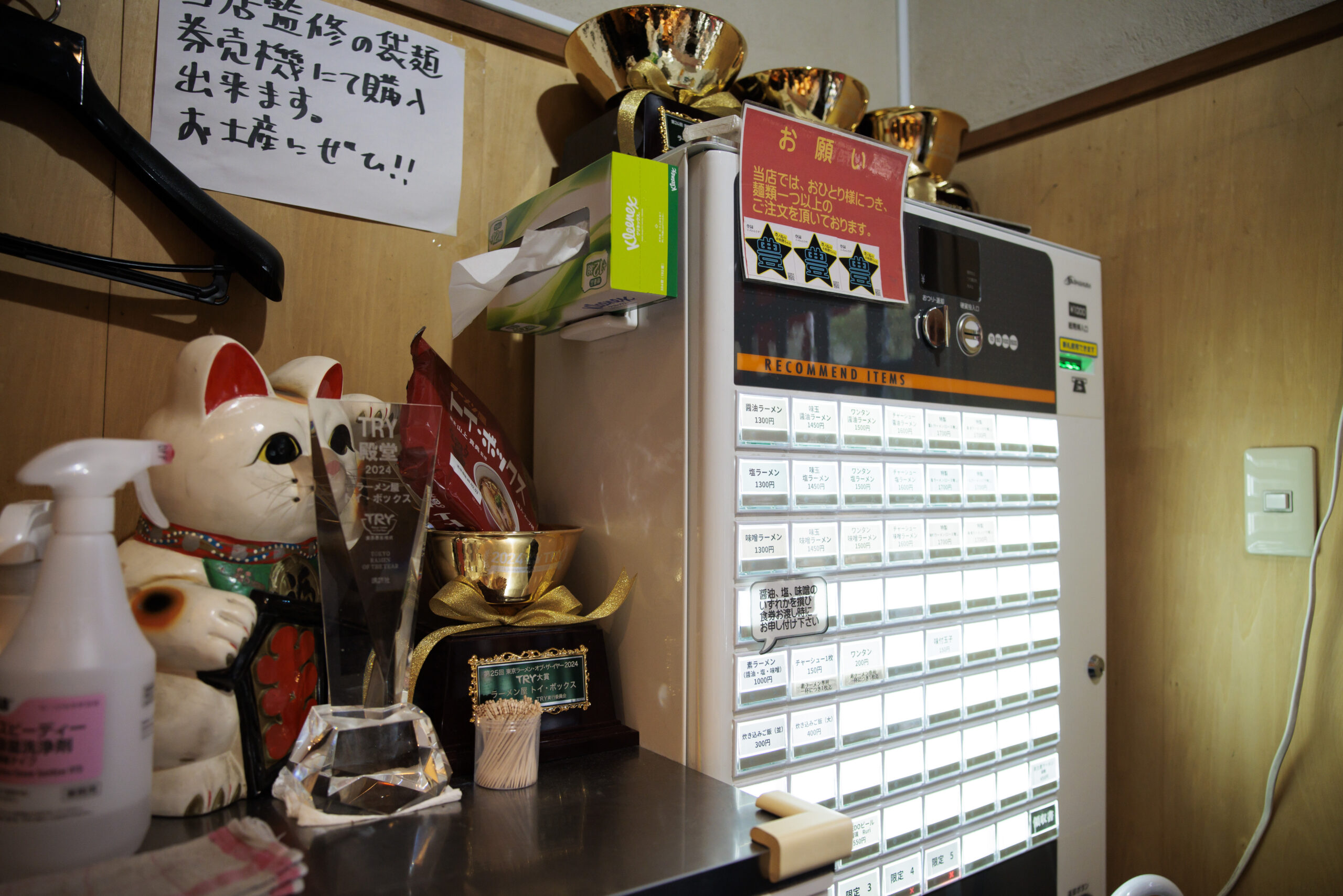 Lindsay Mariko Steigerwald (from left), Hiroshi Nukui, and Jesse Pryor laugh with chef and owner Takanori Yamagami during a meal at Ramenya Toy Box in November. “I think it’s a great thing,” Yamagami says of Steigerwald and Pryor’s move to Tokyo. “If their ramen is good, people will go.” A ticket vending machine is used to pay for ramen at Ramenya Toy Box. Gilded trophy versions of the shop’s bowls attest to its reputation as one of Tokyo’s best ramen destinations.
