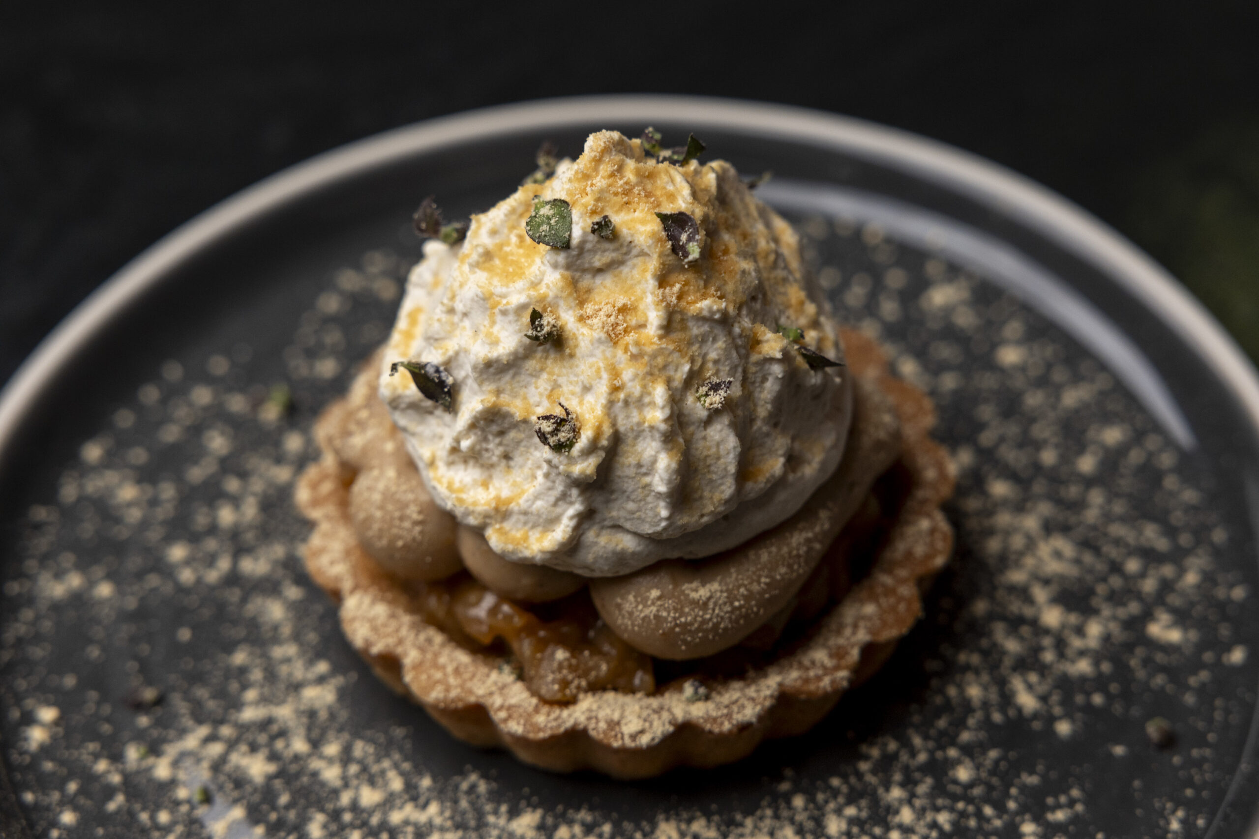 My favorite finale here, courtesy of sous-chef Zoe Delay, is a regal take on the Mont Blanc, a brown-butter shortbread shell filled with brandied apples and a mountain of piped chestnut crème diplomate frosted with a peak of ginger whipped cream. The pastry first found popularity in France in the late 1800s.