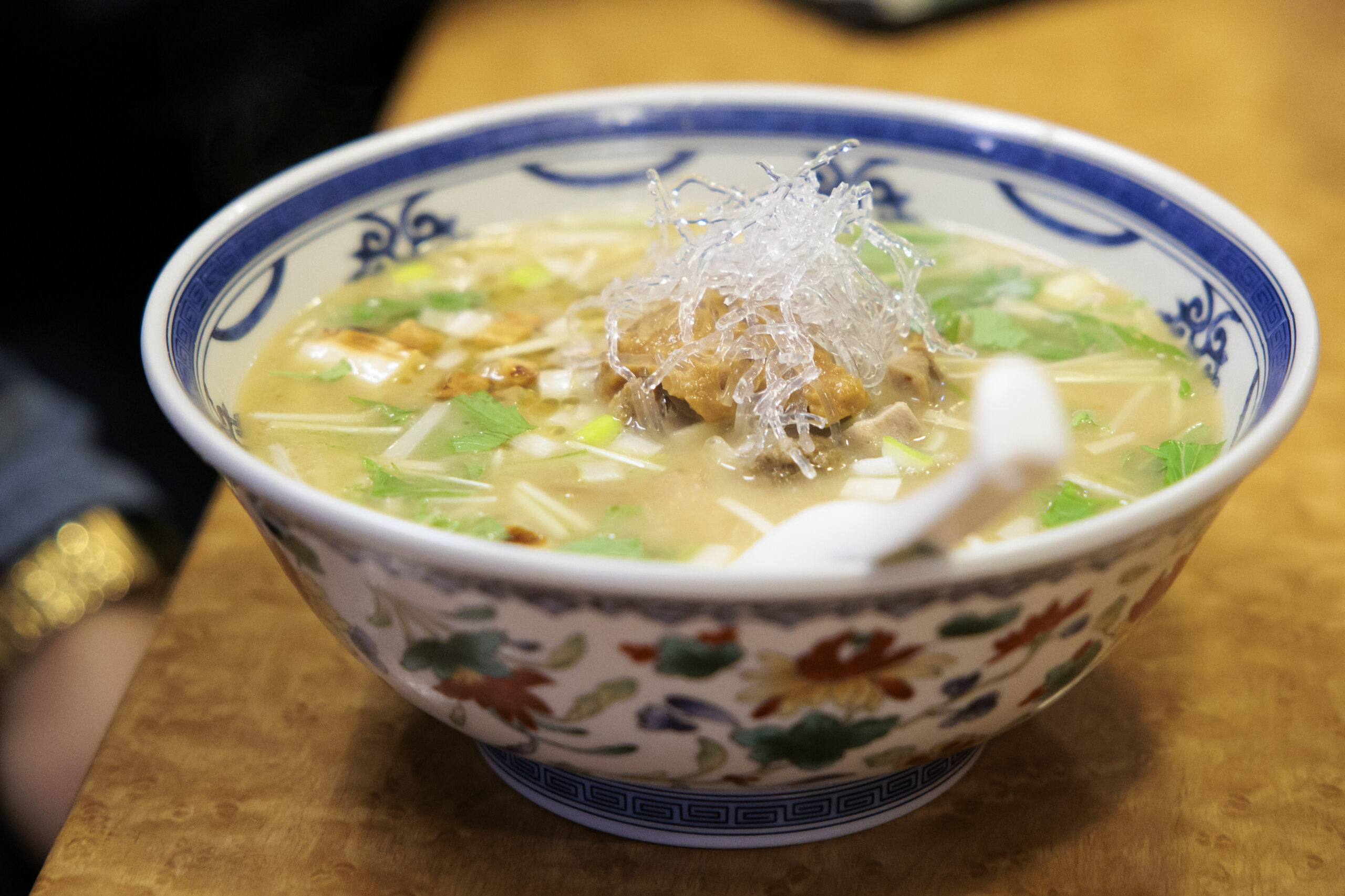 It was a comforting collage of firm but slippery noodles glazed in a nuanced broth with a parade of so many other textures — velvety pork, snappy bamboos shoots, tiny crunchy croutons. If only I could learn to properly slurp, it might be even better.