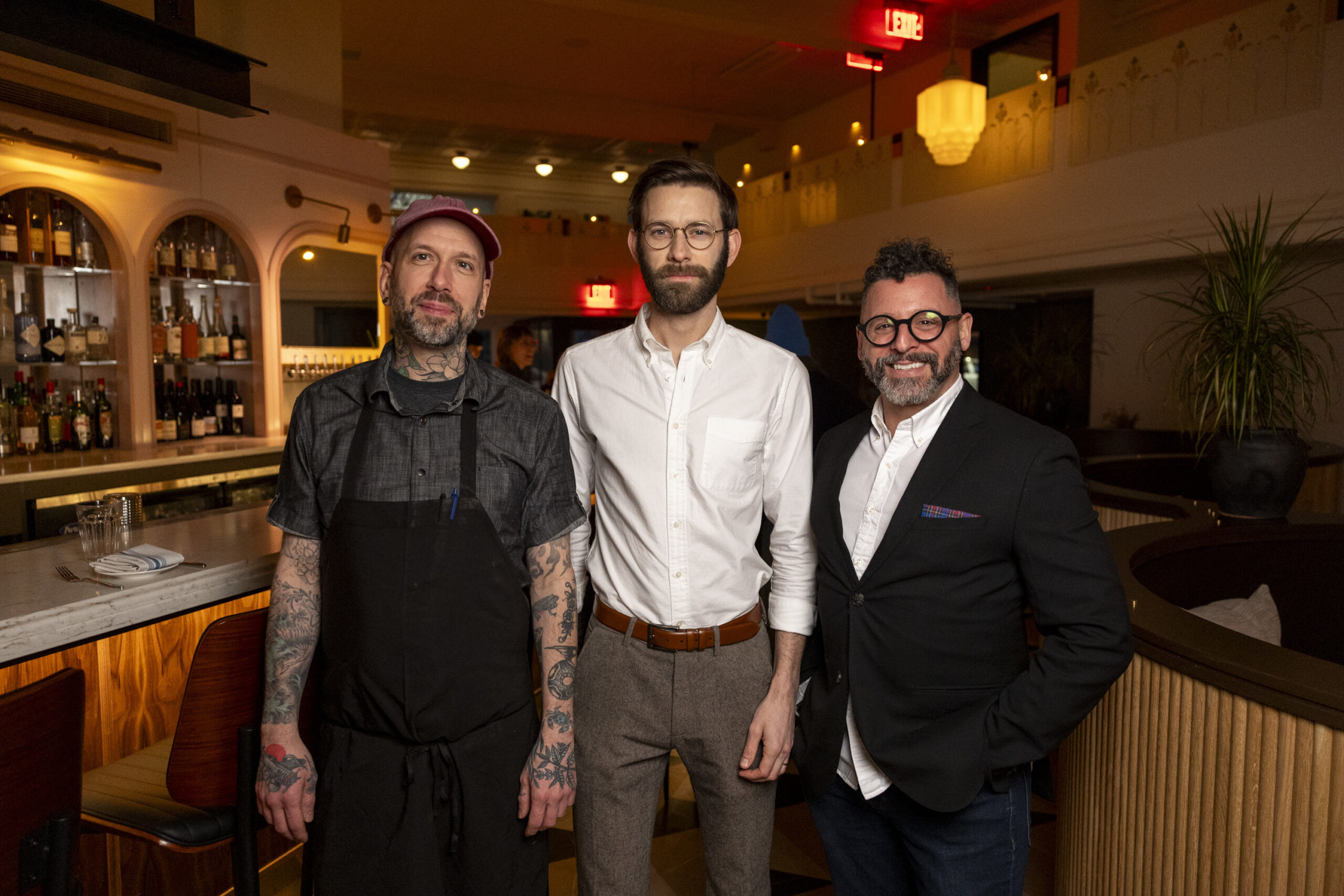 At Fleur’s, partners Graham Gernsheimer (from left), George Sabatino, and Josh Mann in the dining room. The glass lighting fixture is original to the building.