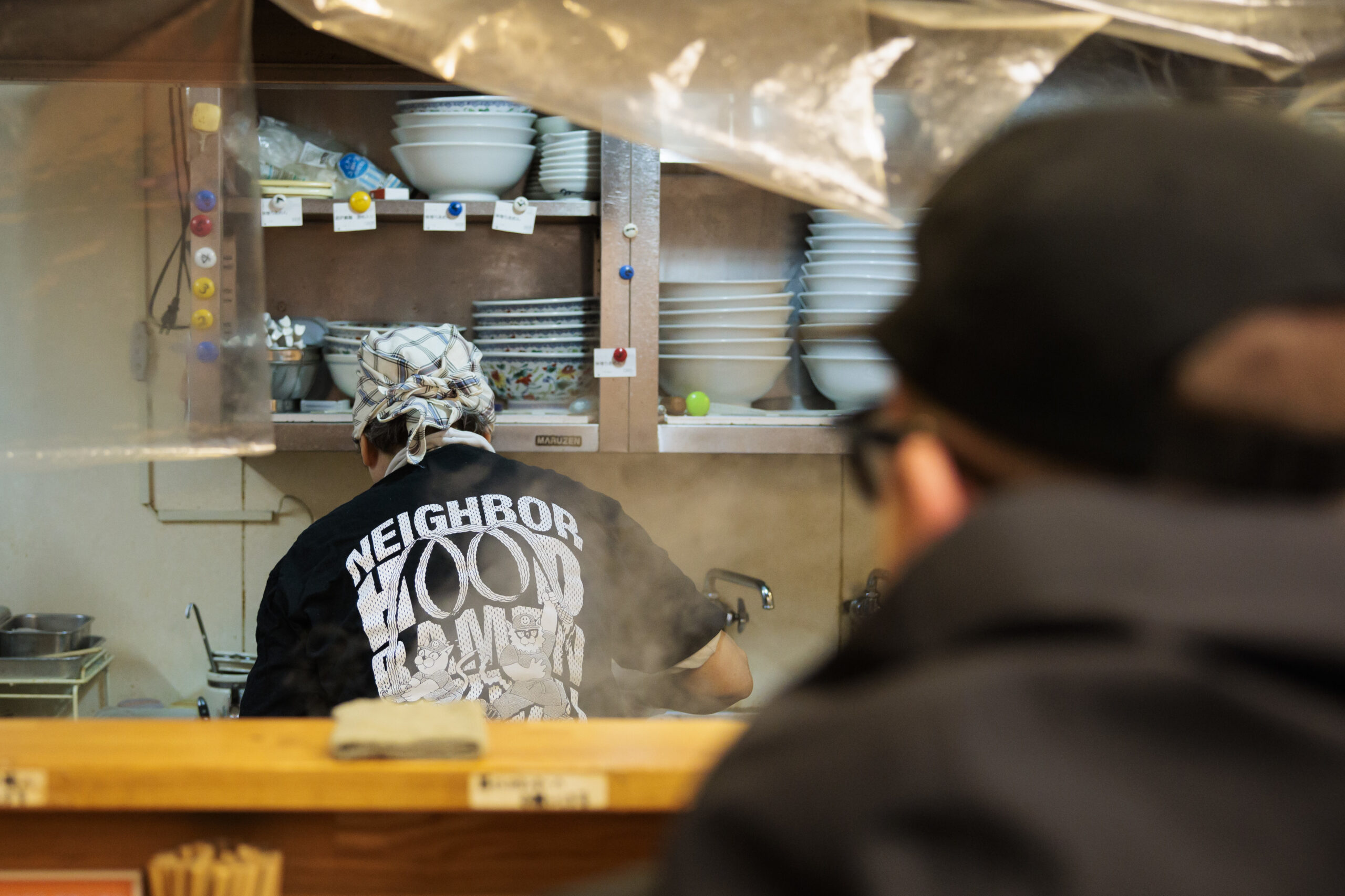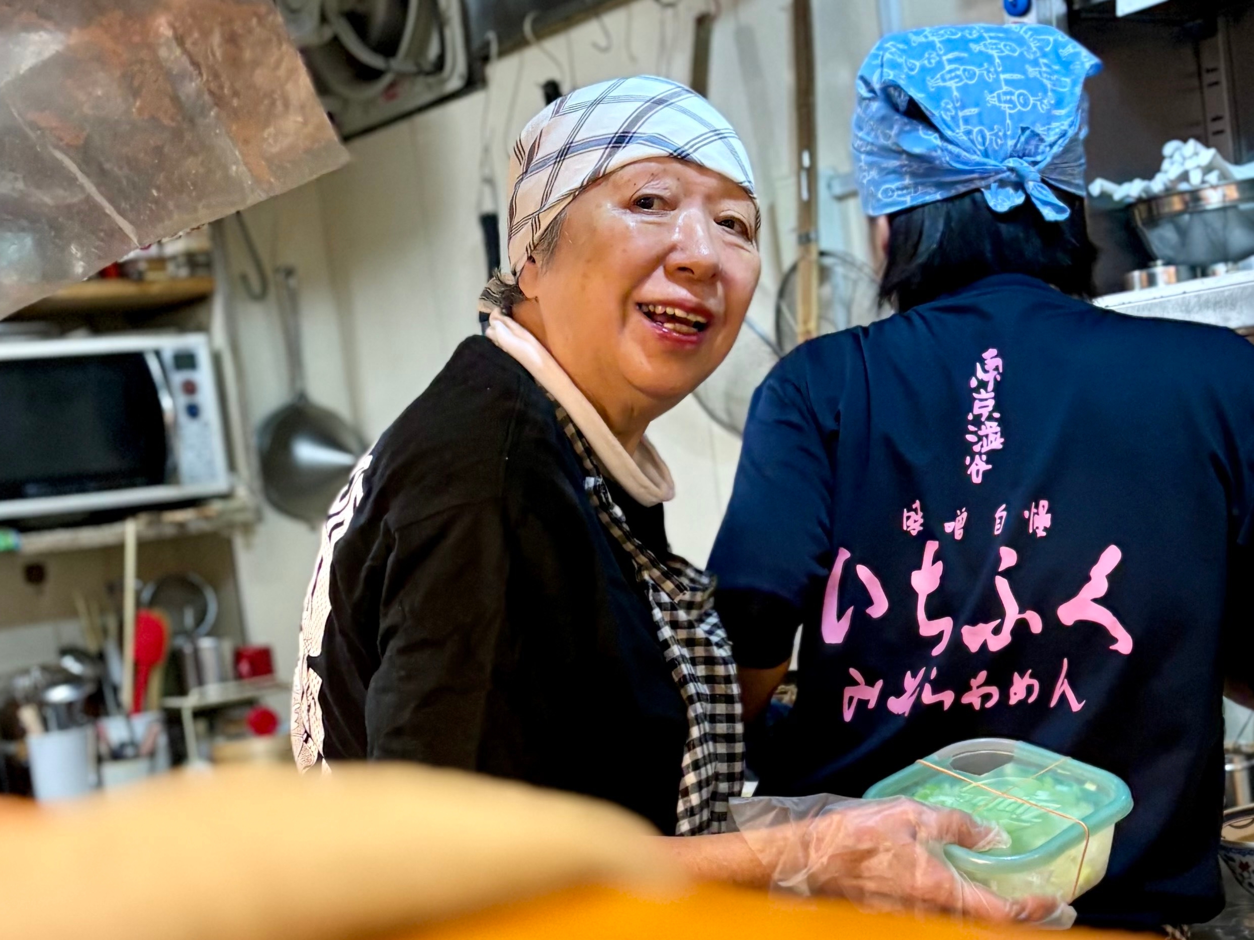 Chef Kumiko Ishida wears a Neighborhood Ramen T-shirt while cooking at her restaurant, Ramen Ichifuku. It is one of the very few ramen shops in Tokyo owned and operated by a woman.