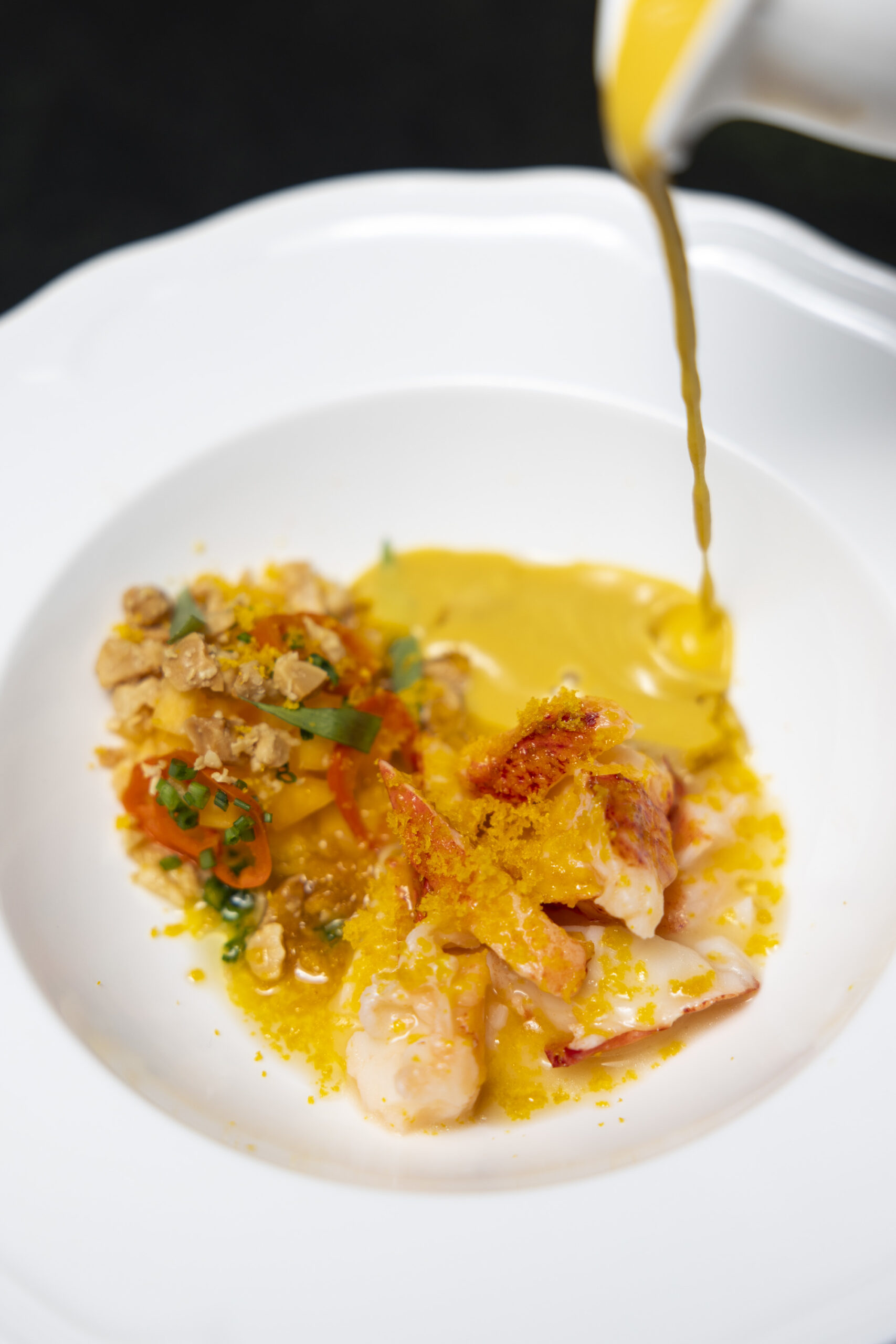 Pumpkin is also transformed into a luxuriously creamy soup with the fermented Japanese rice brew called amazake, poured tableside as an orange velouté over butter-poached lobster and crushed marcona almonds, chiles, and pickled pumpkin.