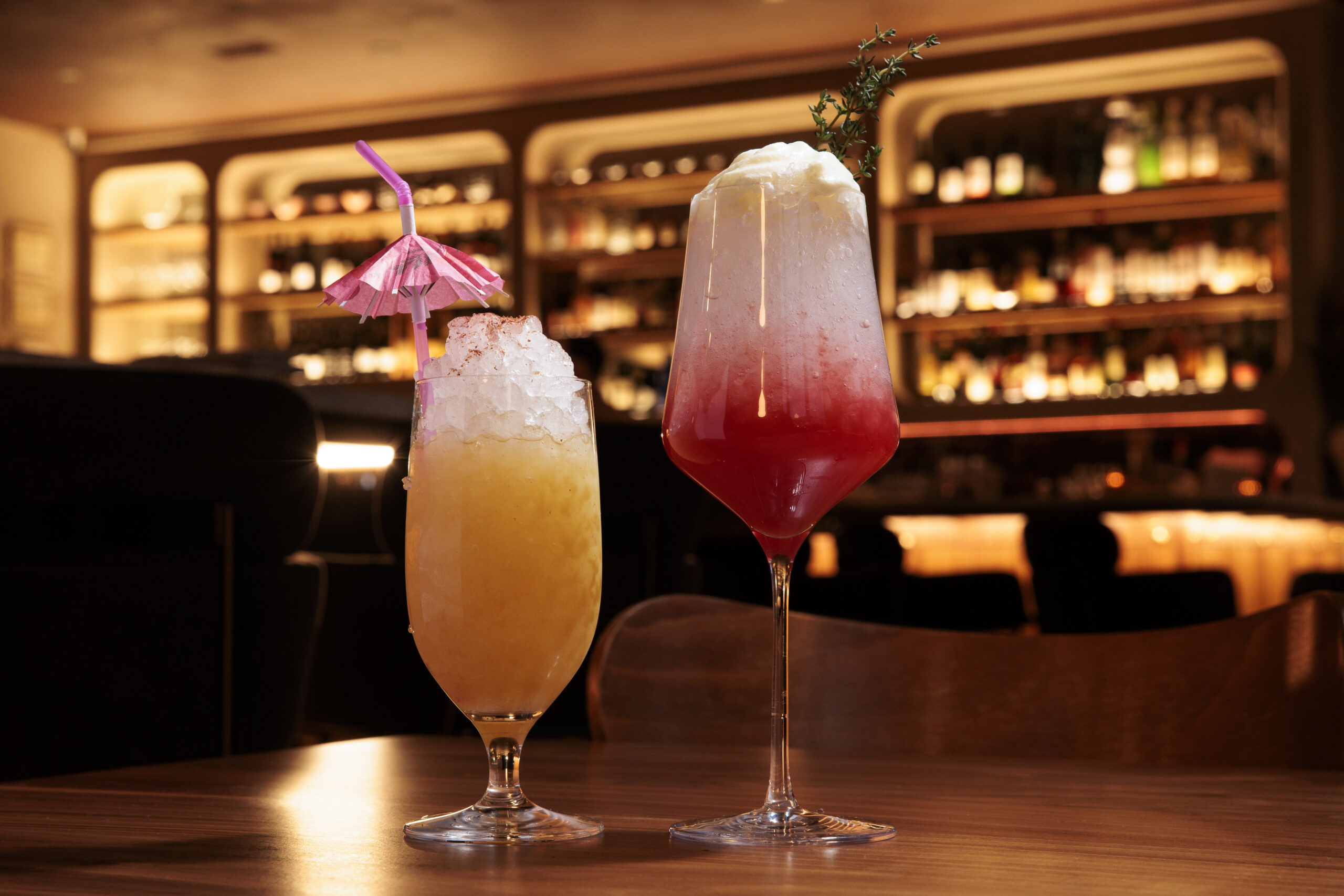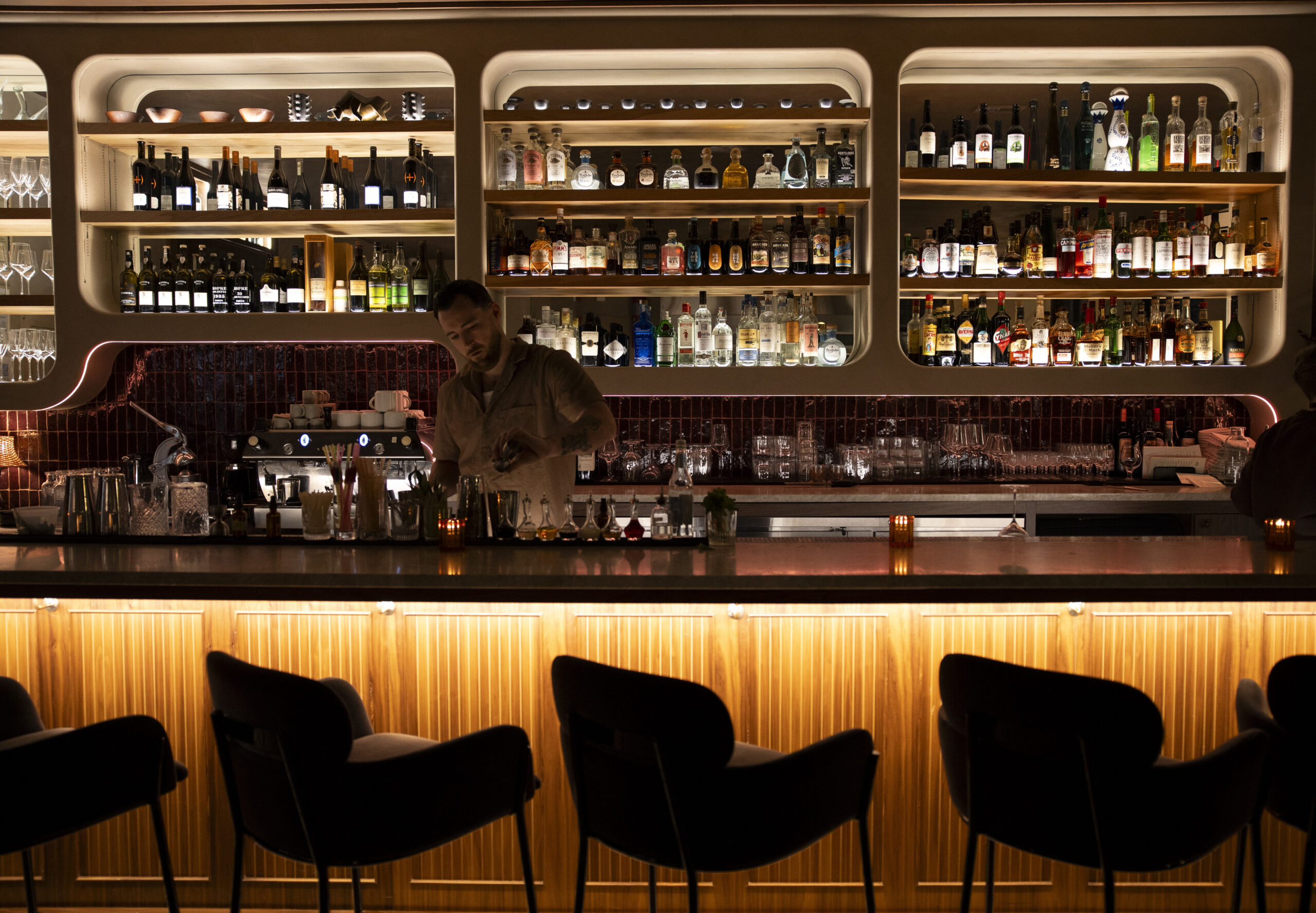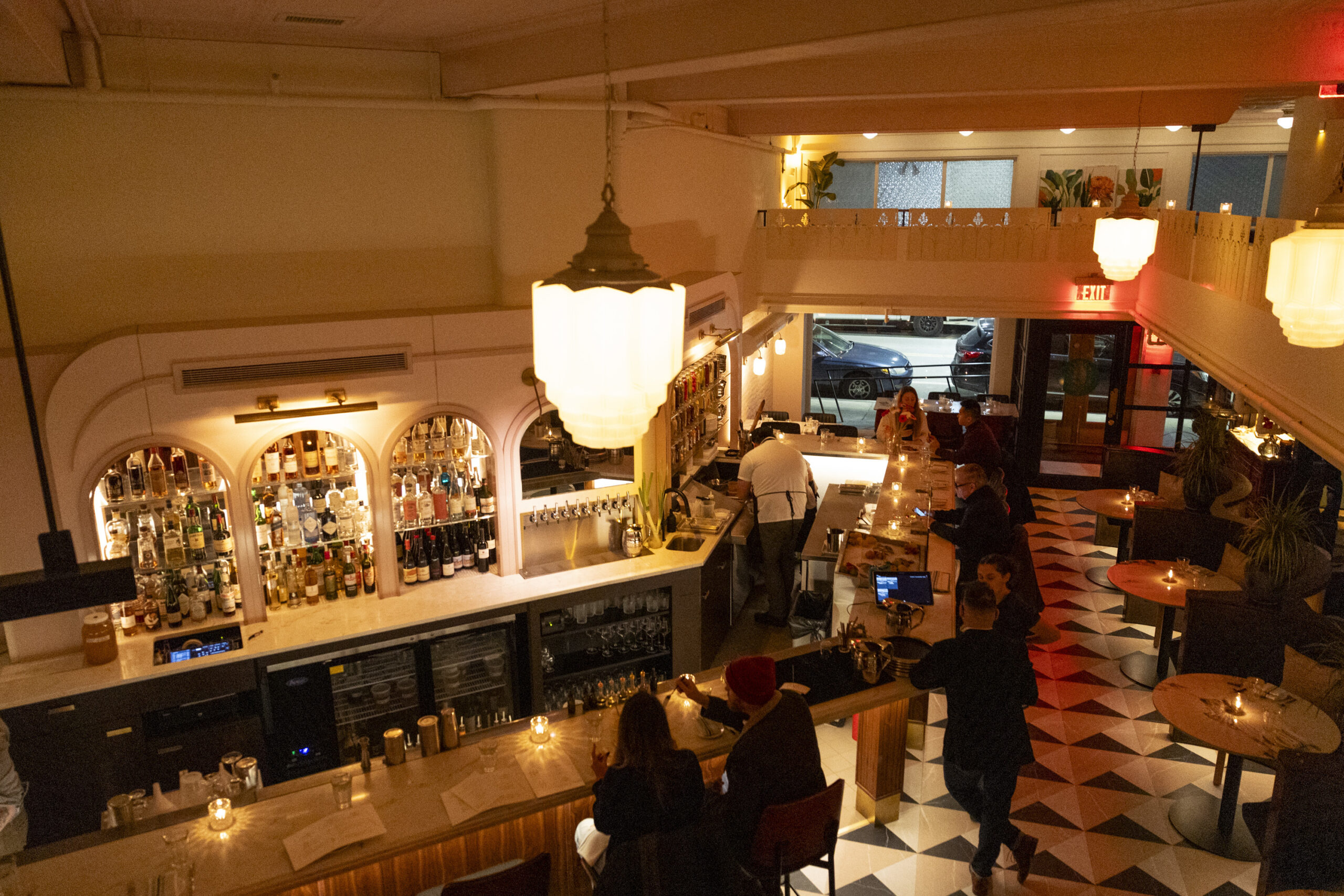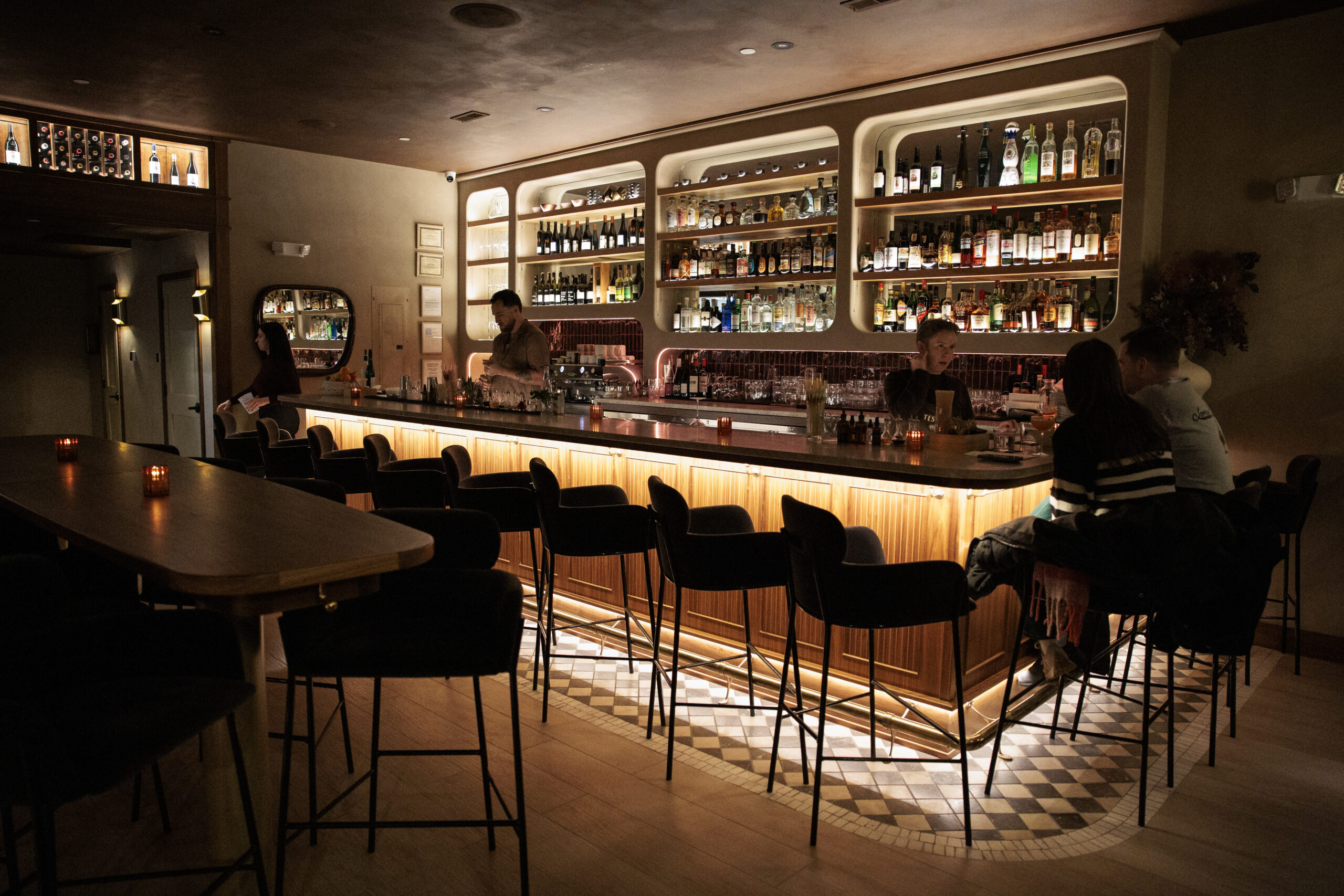 The long bar near the entrance, deftly lit to illuminate its soigné design touches — the rich walnut wood accents, the purple-and-white tiled floor, the smooth curves of a backbar stocked with uncommon sherries — radiated a magnetic glamour.