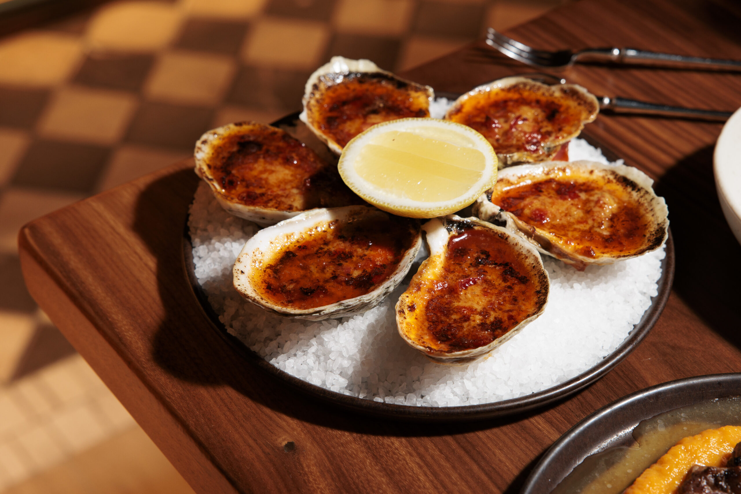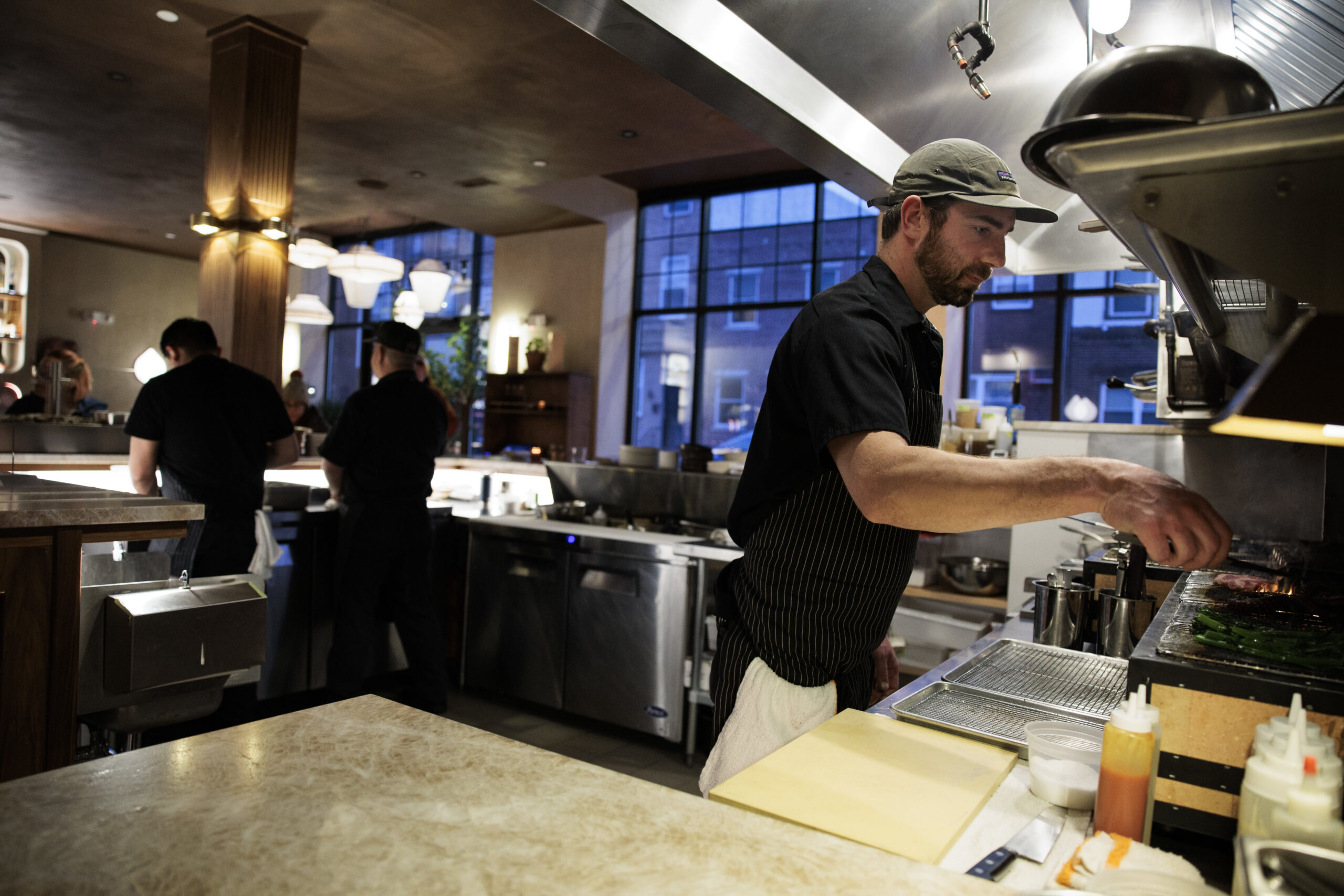 A century-old corner brick building that for much of its life was an auto-repair shop had been completely transformed. Its garage doors were replaced with broad paned windows that glowed amber with the inviting tableau of a bustling restaurant inside. Diners clinked glasses of pink martinis. Chefs were illuminated by the flicker of a live-fire grill in the central open kitchen, where oysters were being shucked at the U-shaped counter, to be dispatched on icy plateaus to date-night duos across the room.