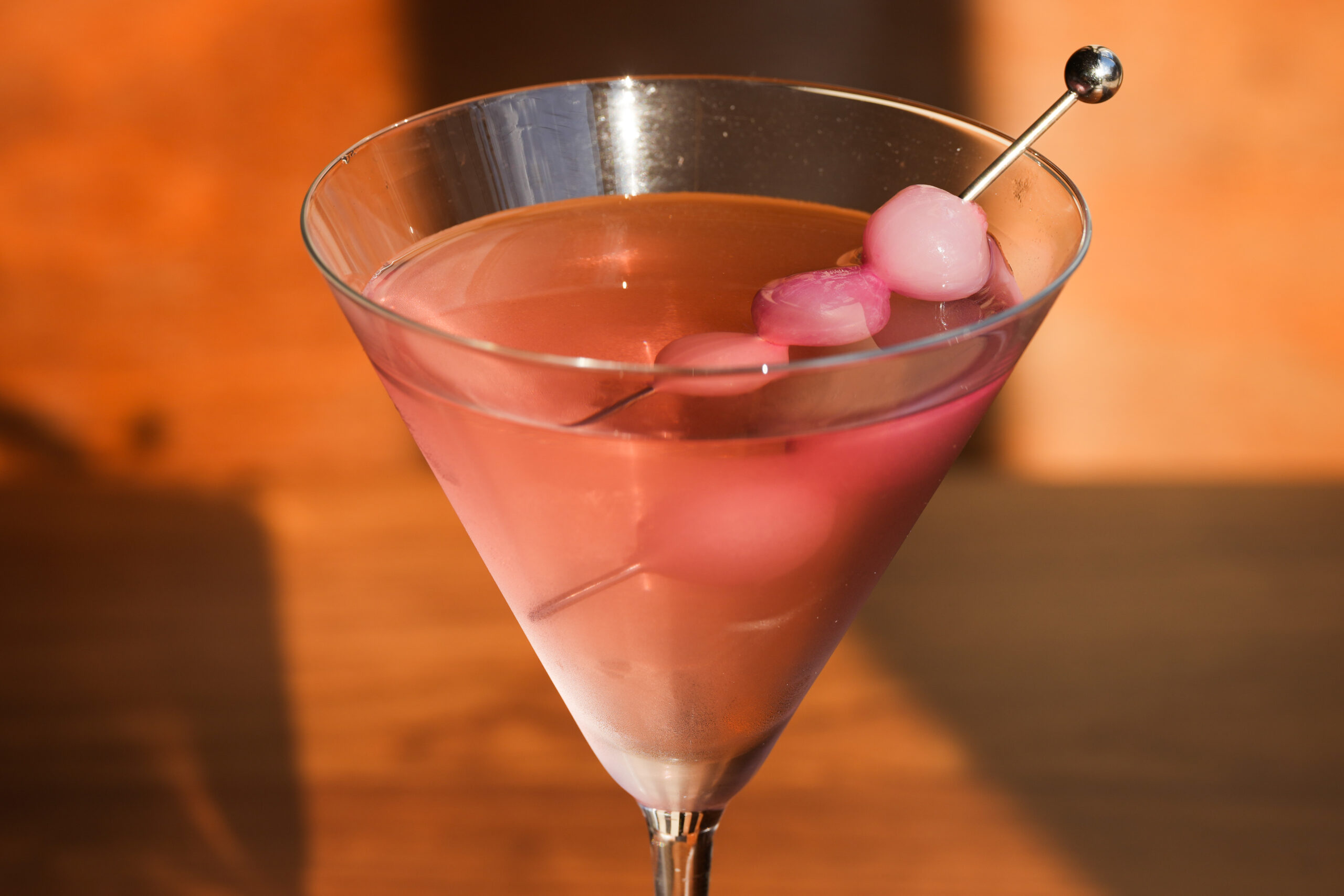 The pink Gibson: Olive-oil washed vodka and gin, pickled red onion brine, manzanilla sherry.The Return of Saturn cocktail and Fizz mocktial at Tesiny on Wednesday, Jan. 21, 2026 in Philadelphia.