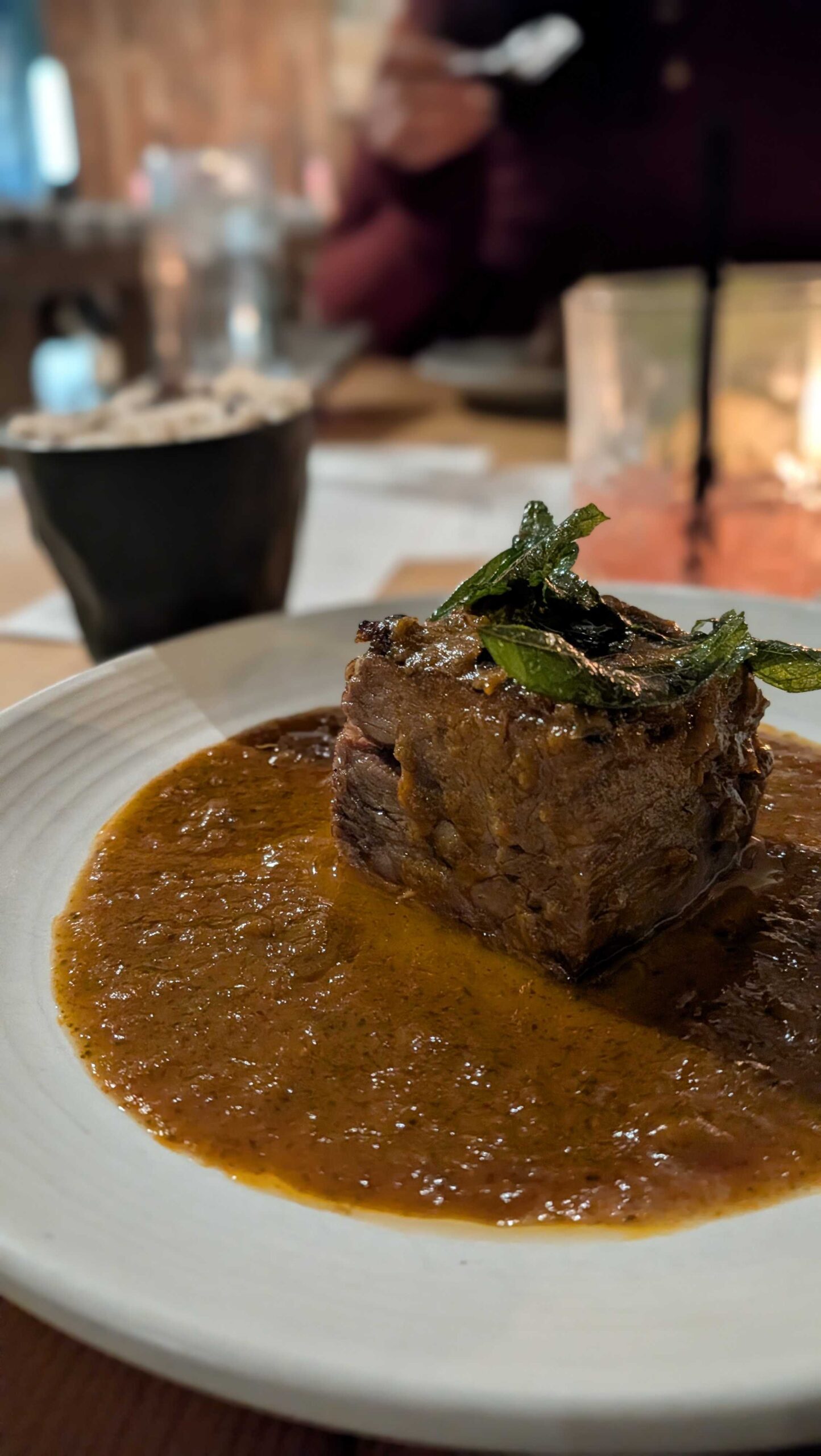 Even more intimate is the “hot tub,” a partially enclosed room for up to eight diners in back. It’s an intriguing nook where conversation is easy and the well-informed, outgoing servers drop details on everything from the smoked beef heart grated over the roasted carrots with puffed amaranth to the pickled-grape prize at the bottom of Fleur’s signature martini (exceptionally aromatic with a French-y touch of Pineau des Charentes). Ultimately, I preferred being part of the date-night energy in the main dining room, even if midweek crowds have been light.