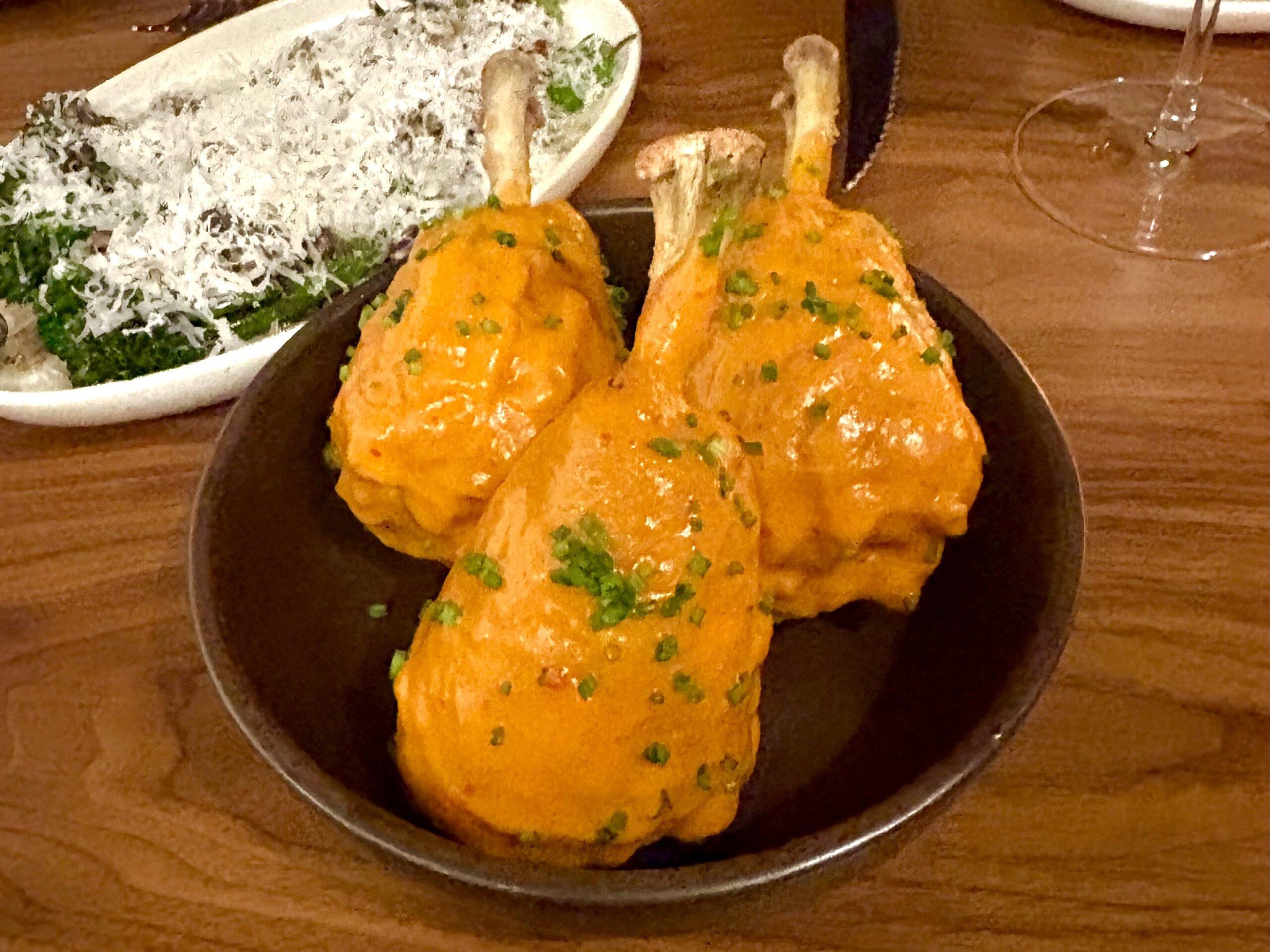 The tidiness impulse is especially clear with Tesiny’s labor-intensive chicken lollipops. Drumsticks of Green Circle chicken are “Frenched” to offer a clean bone handle for the poultry mallets that are double-crisped in rice flour, like Korean fried chicken. Glazed in an orange hot sauce made with Fresno chilies and infused with seafood trim (shrimp shells and scallop “feet”), the lollipops are visually appealing. But for a dish that also wants to evoke Buffalo wings, the sauce’s subtle flavors aren’t quite punchy enough for the maximum impact.