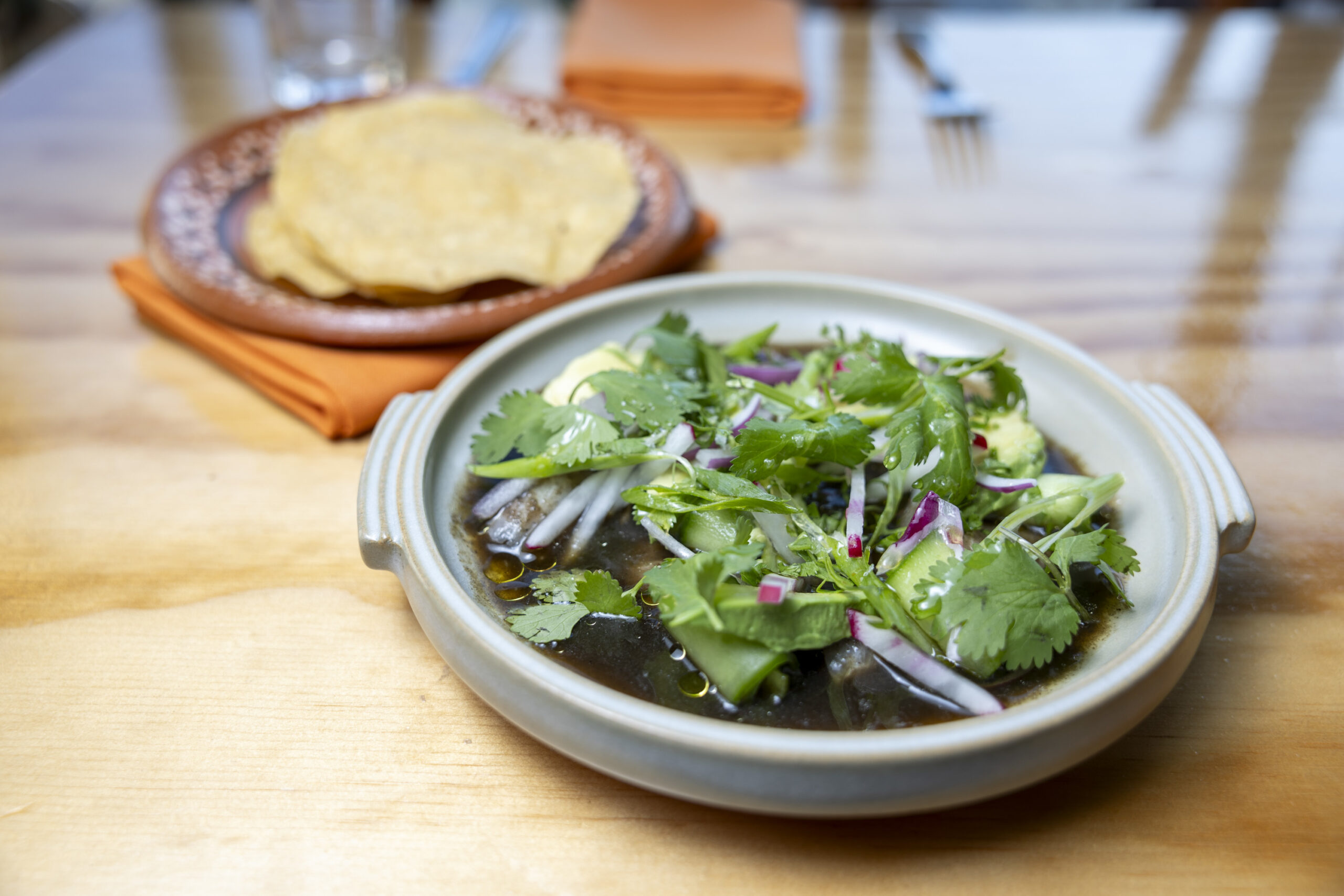 Tlali, which means “land” in Nahuatl, the Indigenous language of Puebla, occupies a simple space on West Chester Pike that took a significant investment to completely rehab. It lacks the design frills of the high-style dining rooms where the brothers have largely worked, including Stephen Starr’s LMNO, where Alberto is still the chef de cuisine. There is nonetheless a comforting warmth to the pale green walls and natural wood wainscoting in Tlali’s dining room, bolstered by hospitality from the restaurant’s single server, Melanie Ortiz. She deftly sorted out a sticky situation by convincing a couple to move to a two-top after she’d accidentally sat them at the only remaining table reserved for a party of four (which happened to be us).