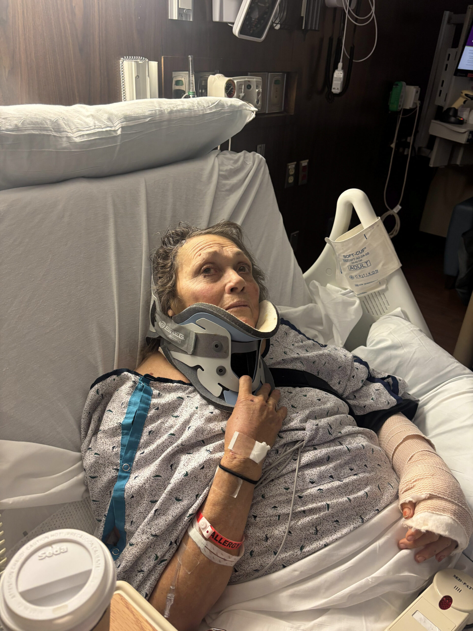 She had suffered a collapsed lung, a brain bleed, and a badly bruised heart muscle. Her spleen and her kidney were lacerated. Her sternum, thoracic vertebrae, collarbone, and 13 ribs were broken, along with her left leg.
