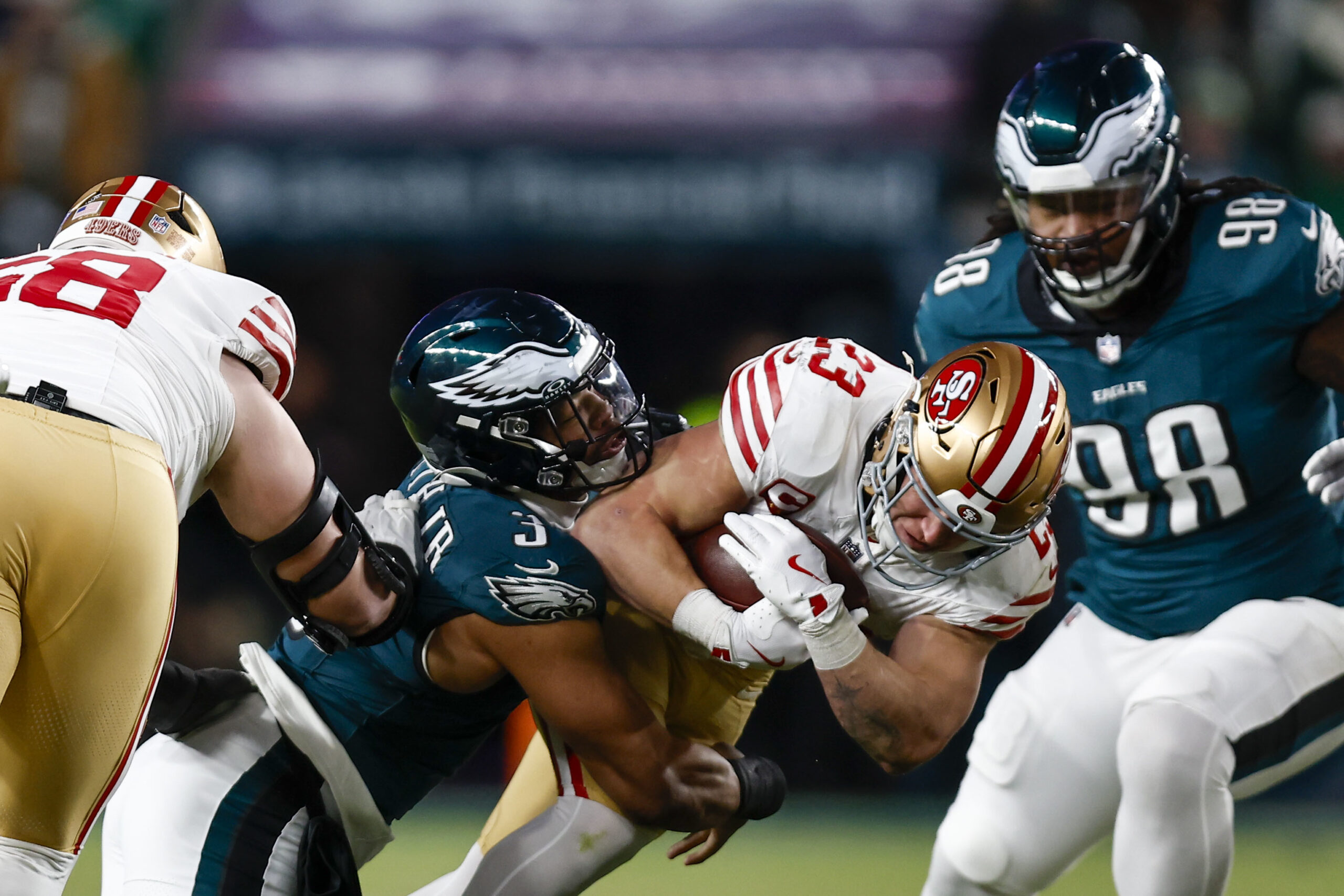 The Eagles held running back Christian McCaffrey to just 1.6 yards on eight carries in the first half. Defensive tackle Jordan Davis was a beast up front, per usual, and led the Eagles with four stops before halftime. He made three straight stops on McCaffrey in the second quarter that forced fourth down.