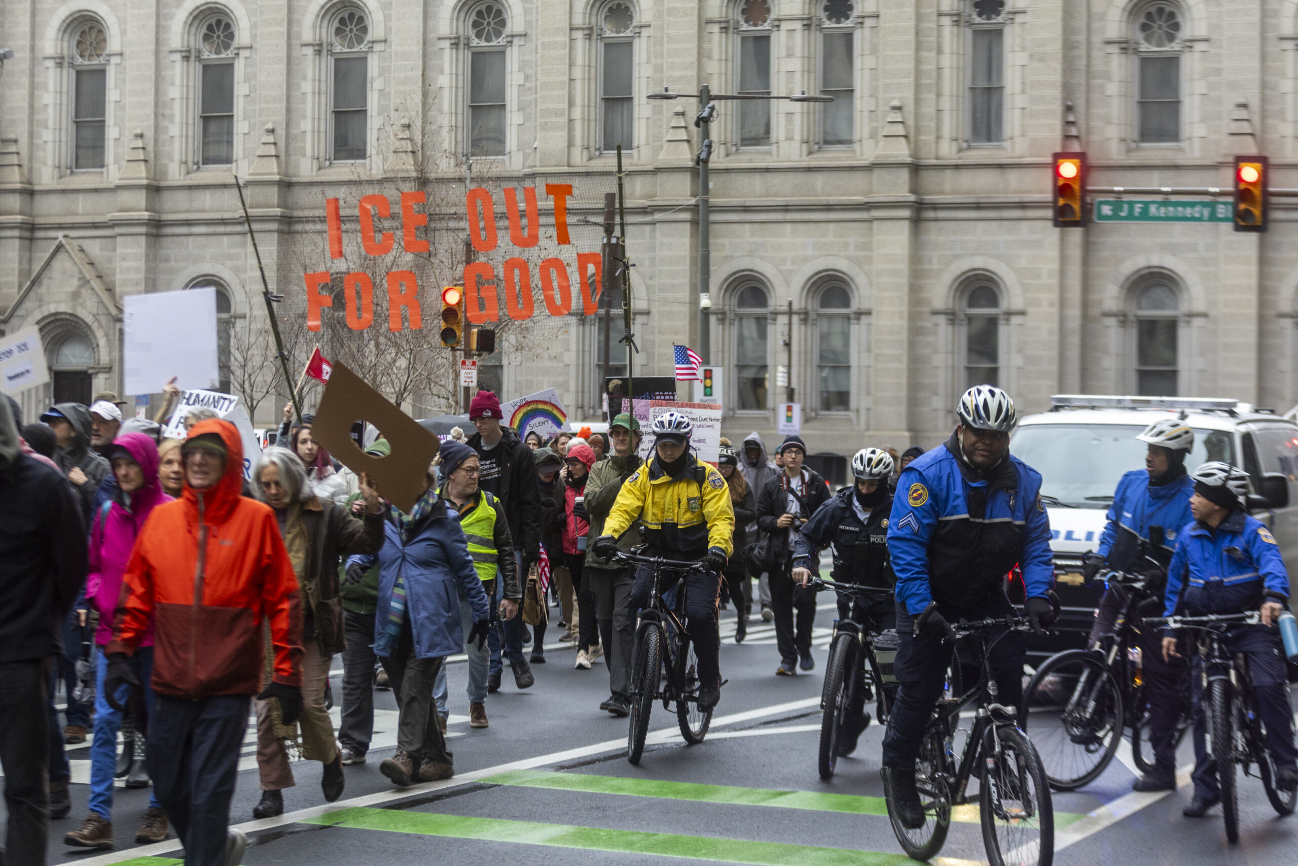 In Philadelphia the day began in a cold, steady rain, with about a hundred people at City Hall chanting, “No fear, no hate, no ICE in our state.”