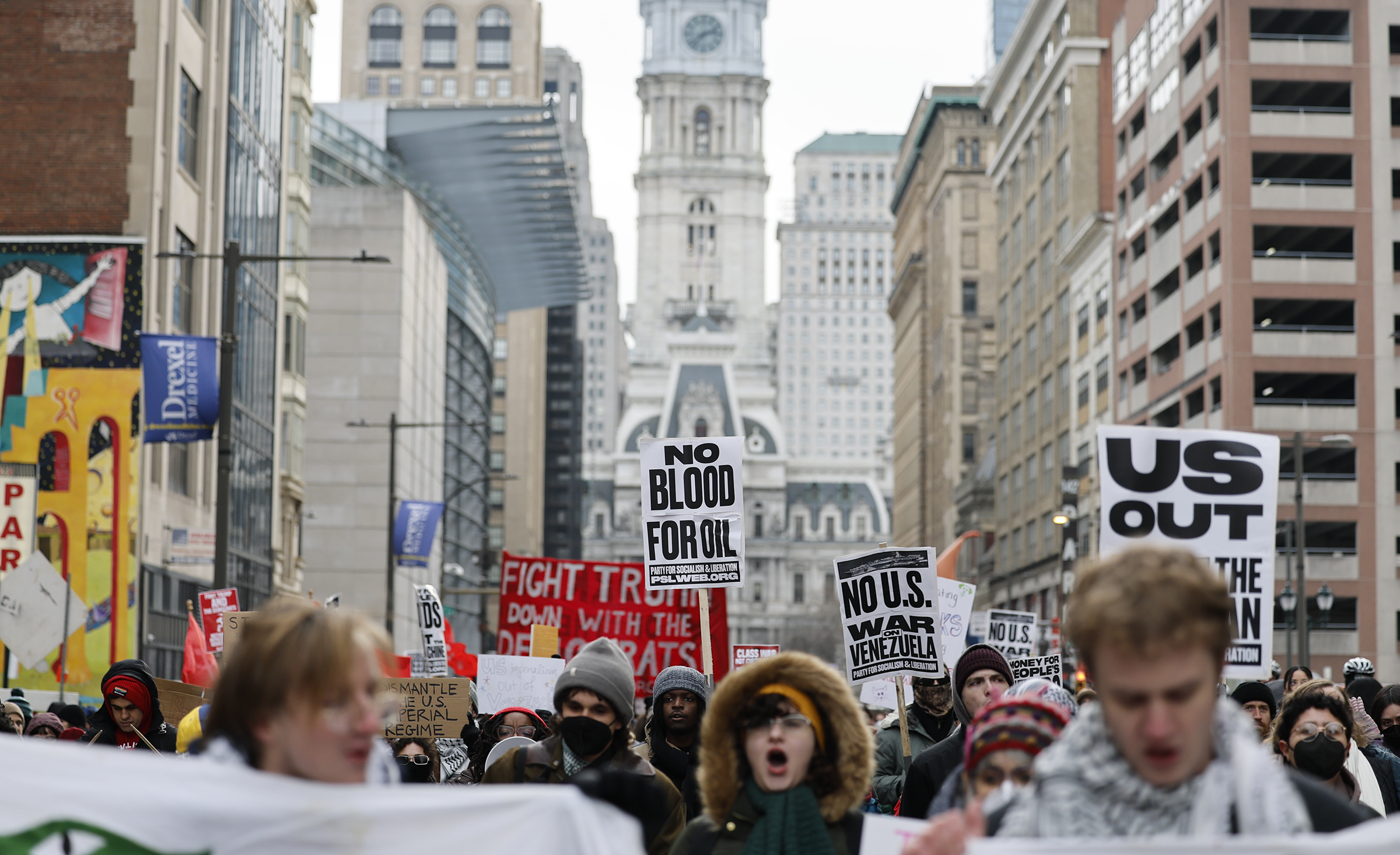 Demonstrators march along North Broad Street reacting to U.S. strikes on Venezuela on Saturday.