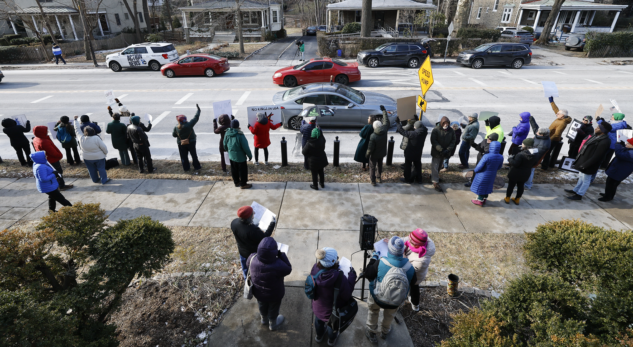 Residents of Northwest Philadelphia voice their opposition to the Trump administration’s strike against Venezuela in a vigil outside the Unitarian Society of Germantown on Sunday, Jan. 4, 2026.