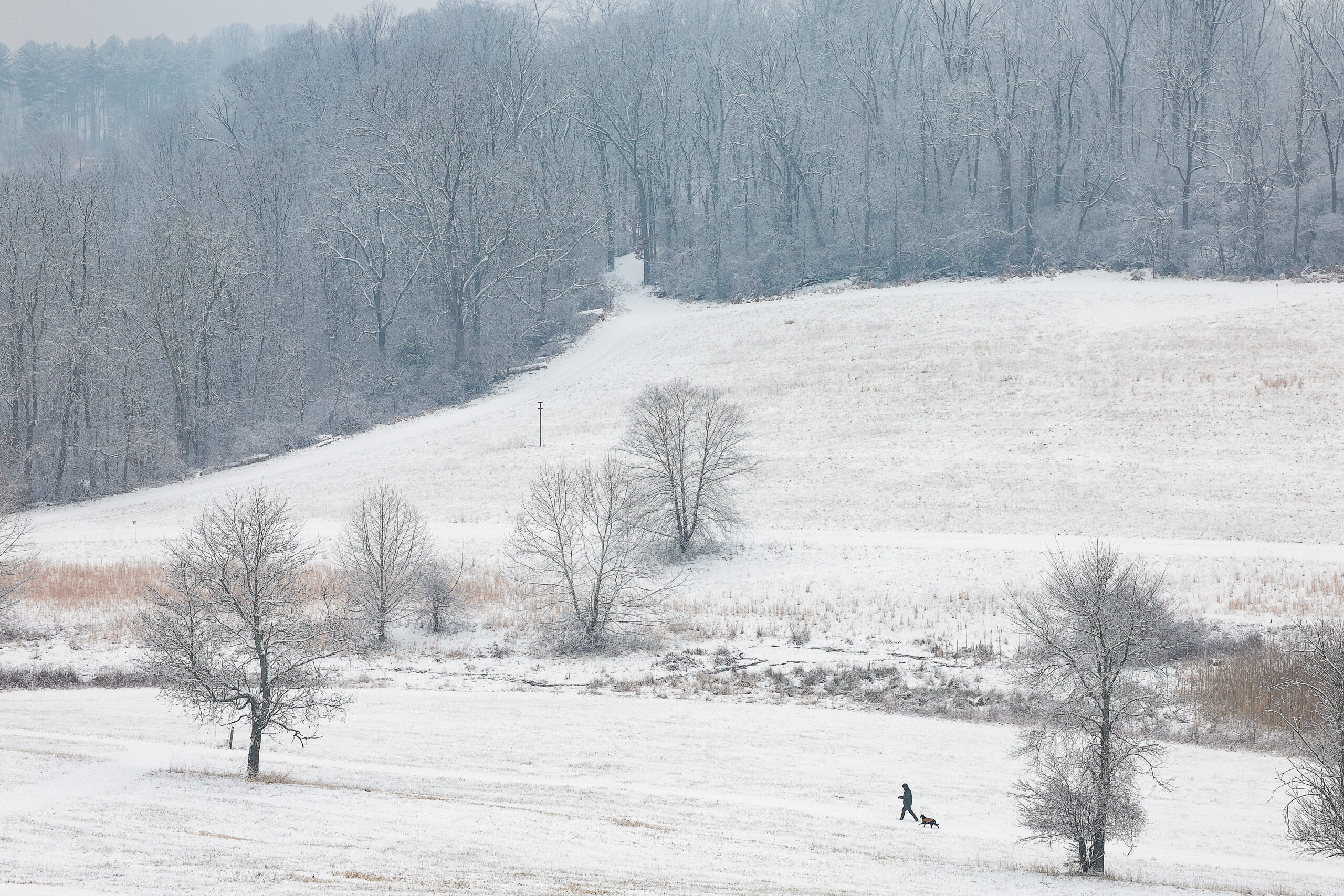 David Bond, of West Chester, walks his dog, Todd, in the snow at Okehocking Preserve in Newtown Square on Sunday, Jan. 18, 2026.