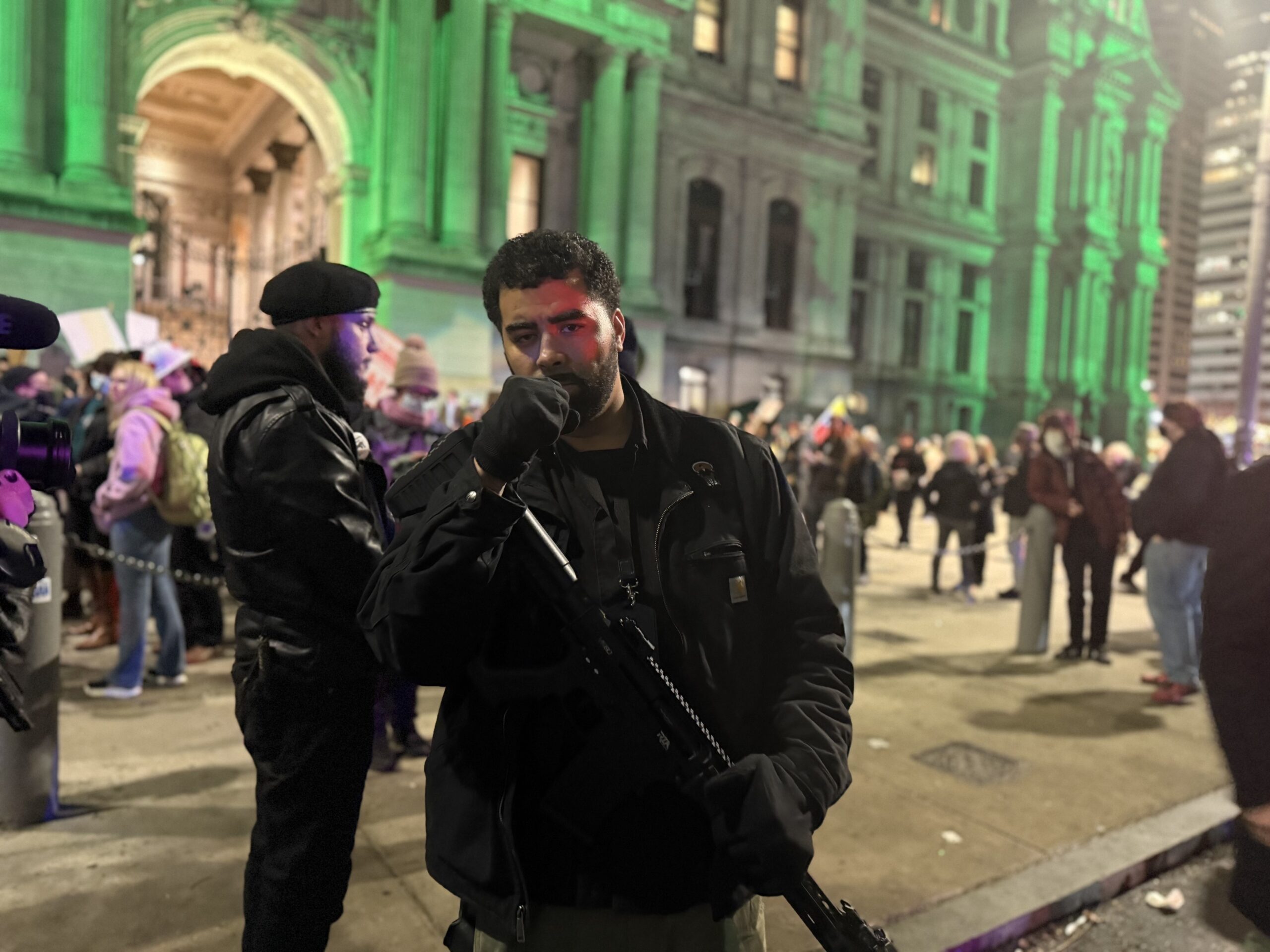Several armed men who identified themselves as the Black Panther Party for Self-Defense, including Paul Birdsong, stood outside a protest at City Hall against an ICE shooting in Minneapolis.