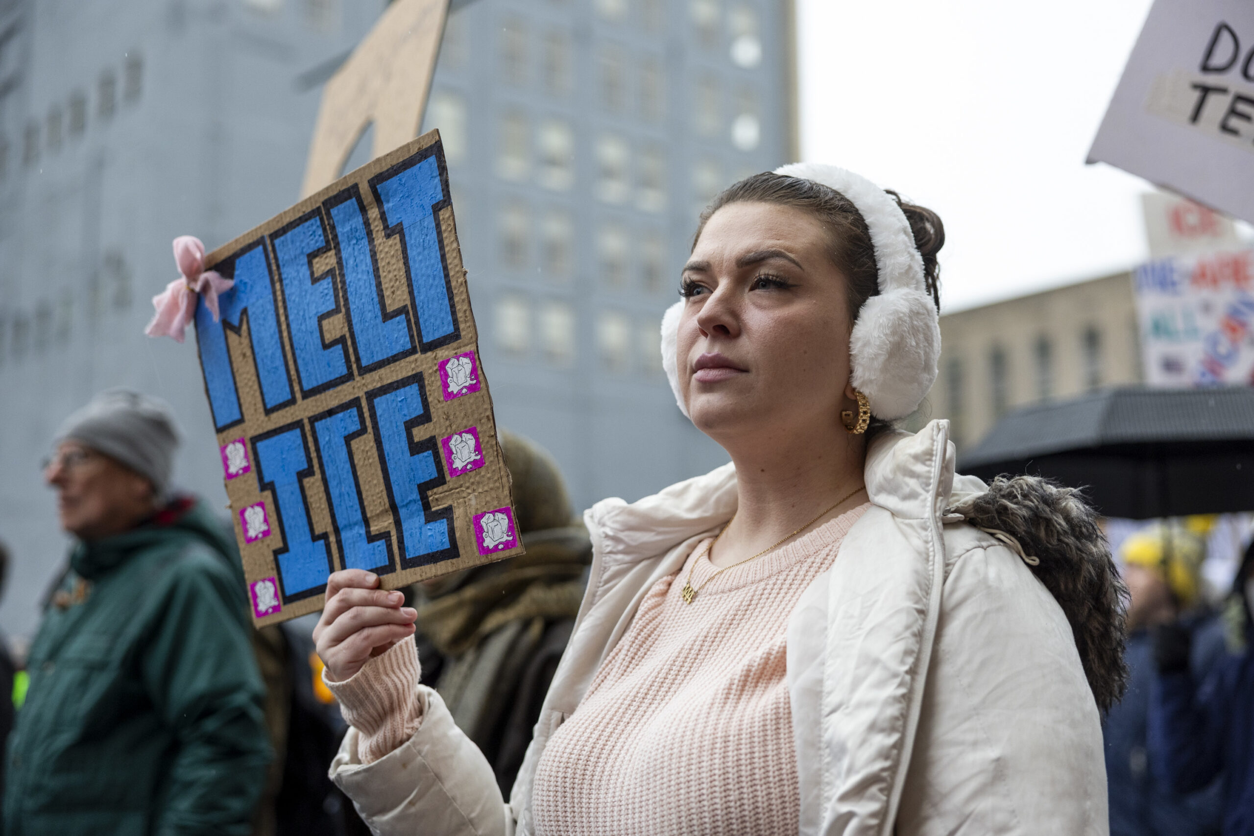 Tiffanie Knott, of Rittenhouse, holding a sign reading “Melt ICE” as she marches with many others to protest against ICE in Philadelphia, Pa., on Saturday, Jan. 10, 2026.