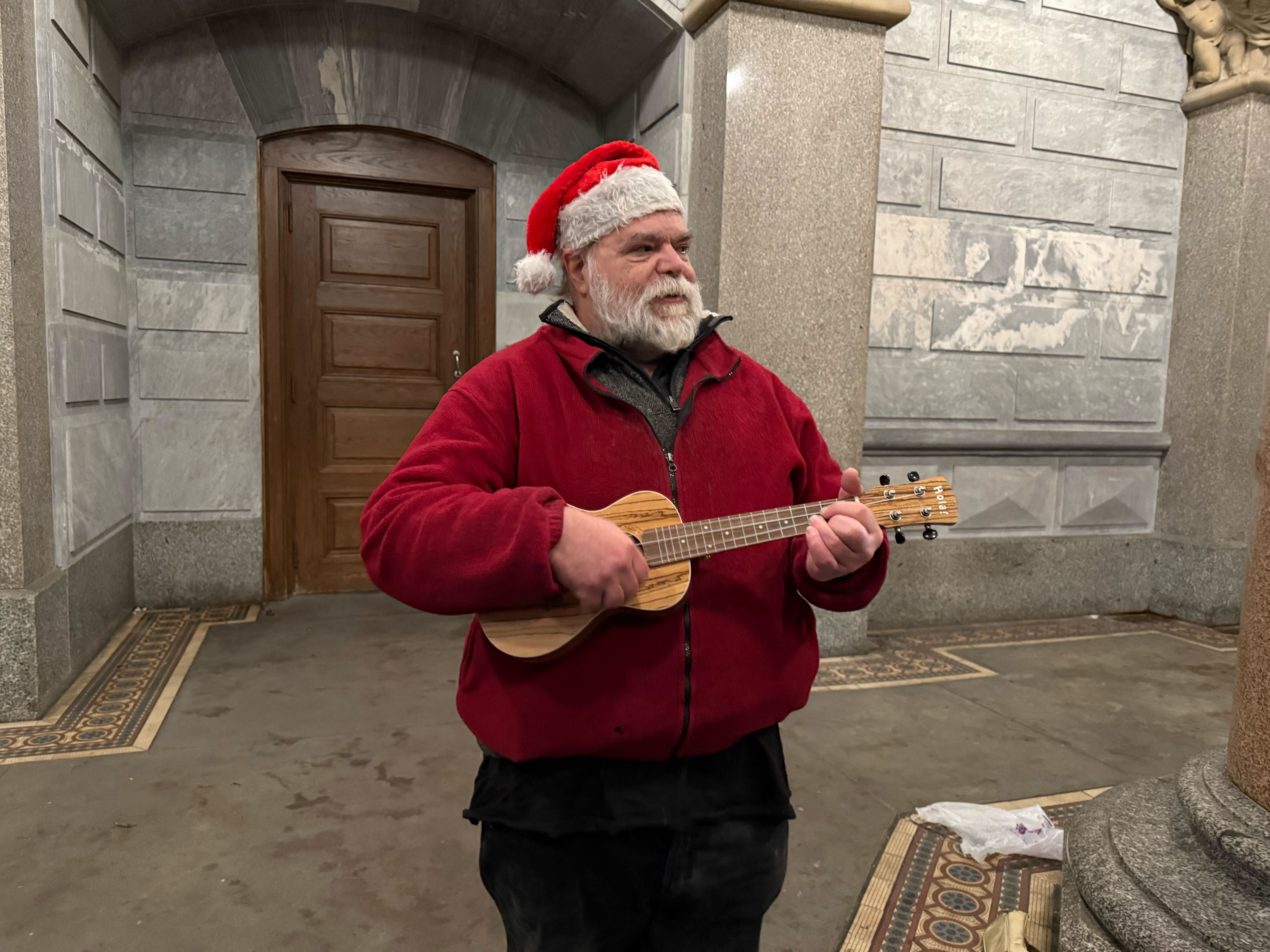 Playing Christmas carols on the north side of City Hall, a white-bearded man dressed in red, hat and all, was surprised to hear our request.