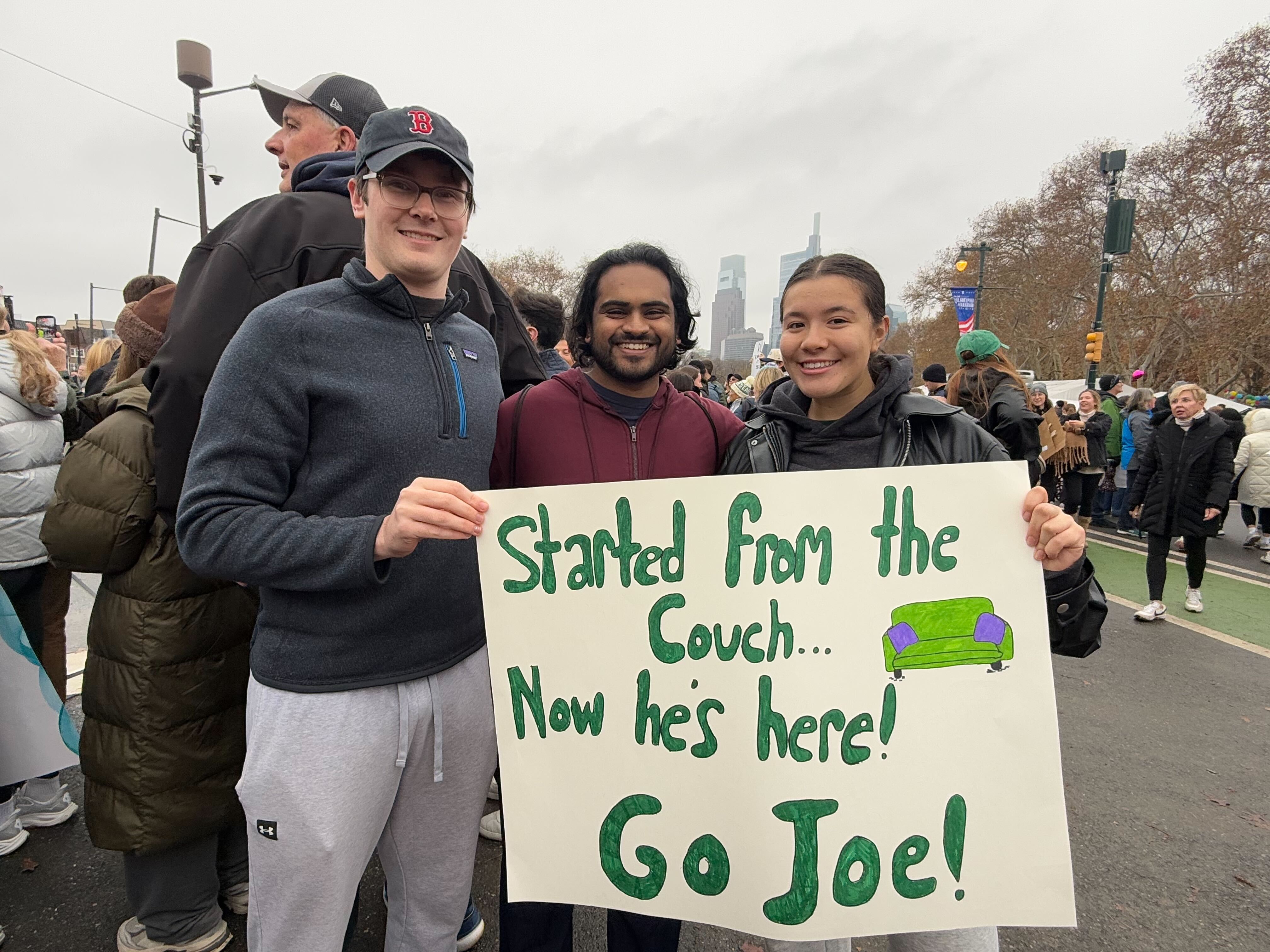 “Started from the couch … now he’s here!” read a sign held by three Villanova college students. They came to support their friend Joe.