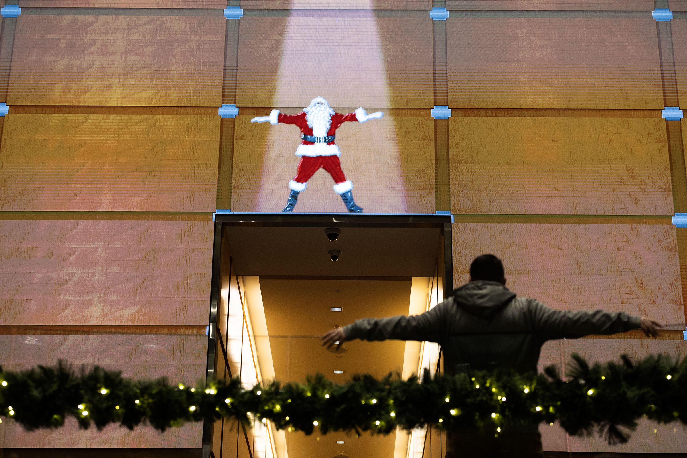 A man watches a dancing Santa with a similar body language in the lobby of the Comcast Technology Center during a Dec. 15, 2023, holiday video presentation.