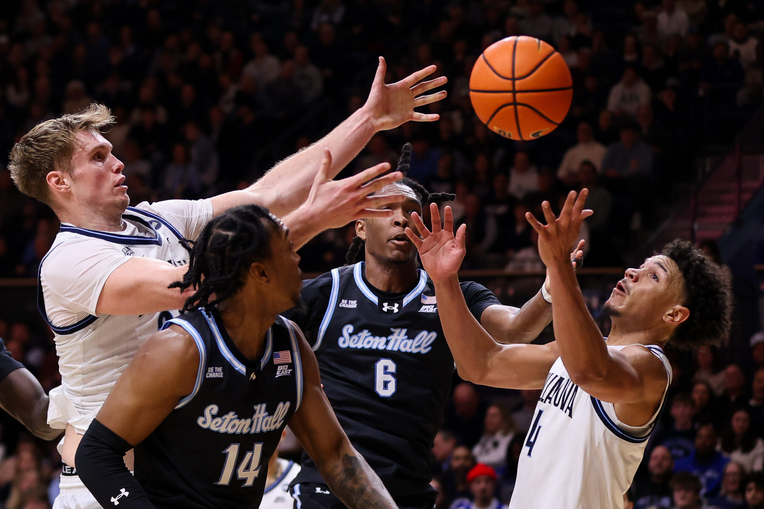 Villanova forward Duke Brennan and guard Tyler Perkins compete for a rebound against Seton Hall.