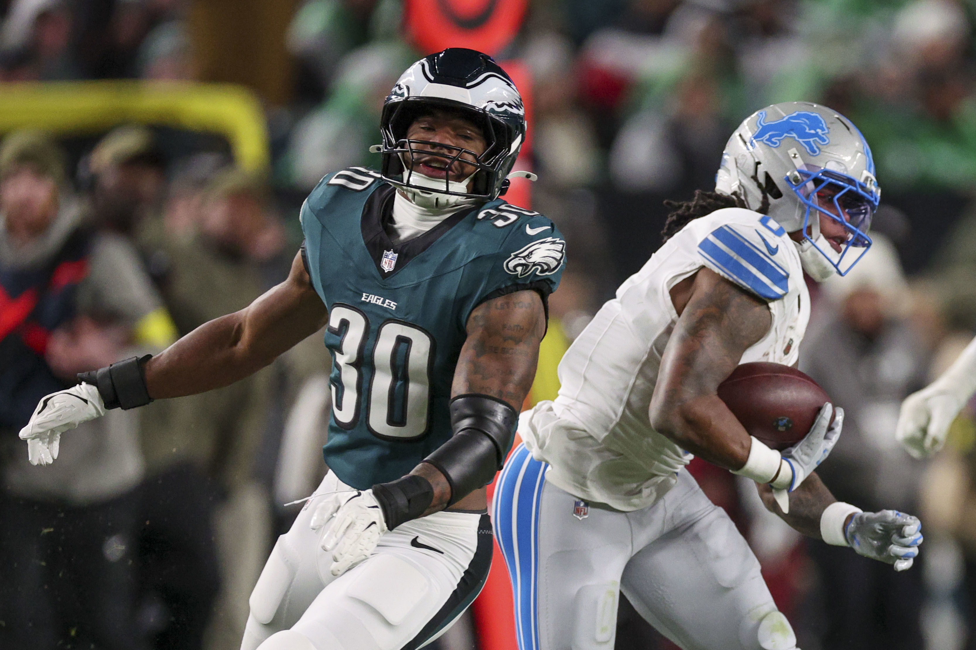 Lions running back Jahmyr Gibbs slips past Jihaad Campbell of the Eagles on Sunday night.