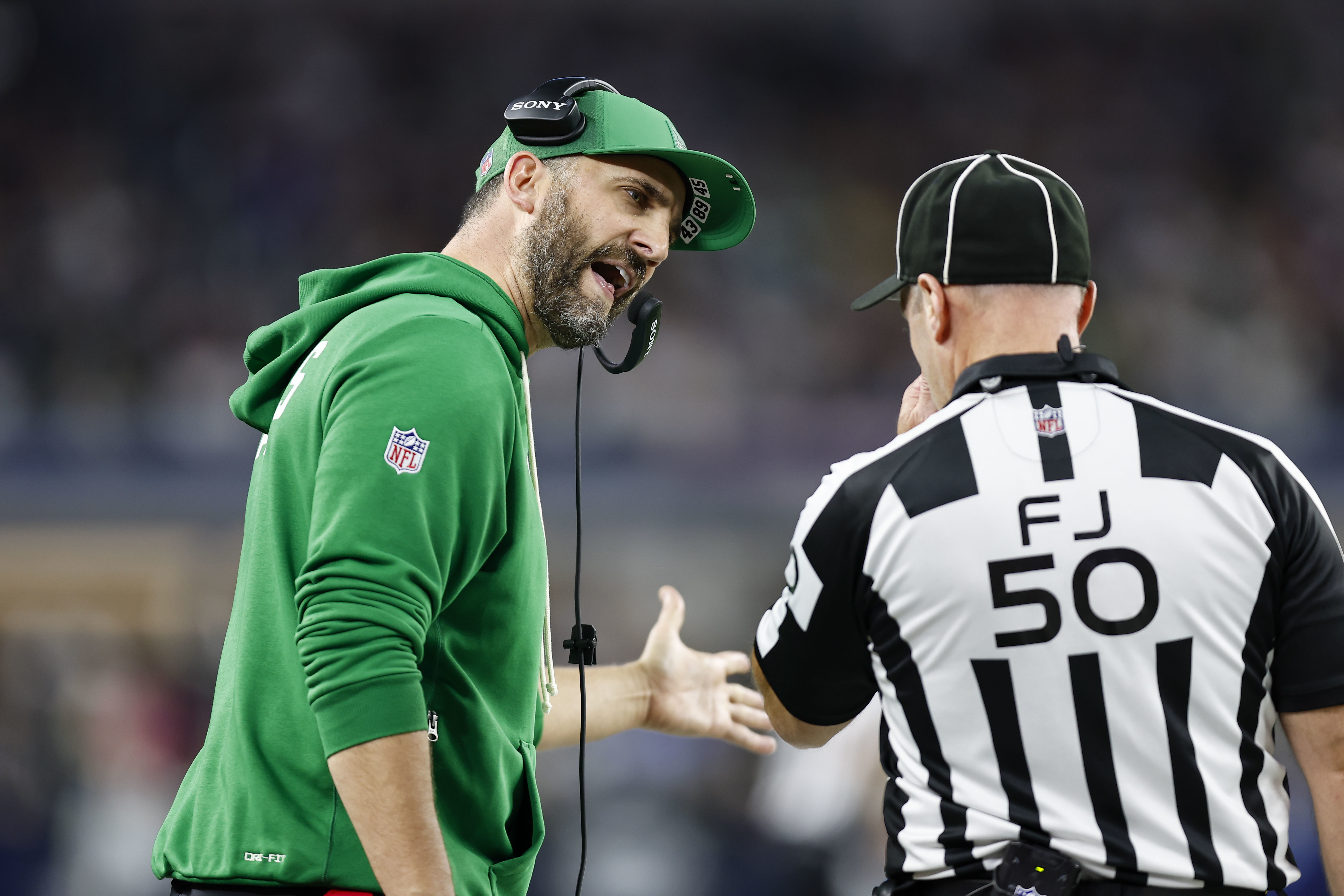 Eagles head coach Nick Sirianni has some words for an official during the the fourth quarter of his team’s 24-21 loss to Dallas.