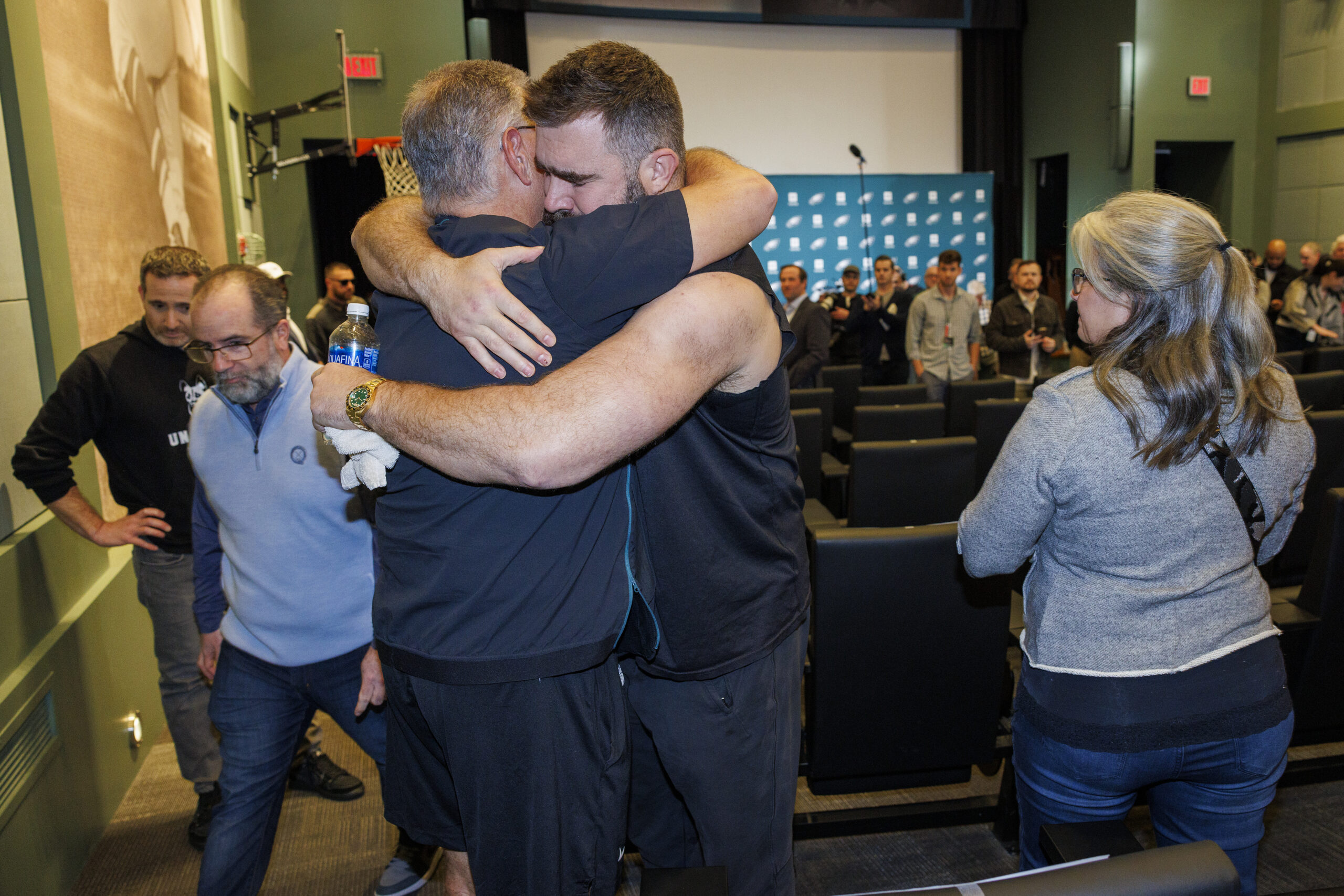 Jason Kelce embraces Jeff Stoutland after Kelce announced his retirement at the Novacare Complex on March 4, 2024.