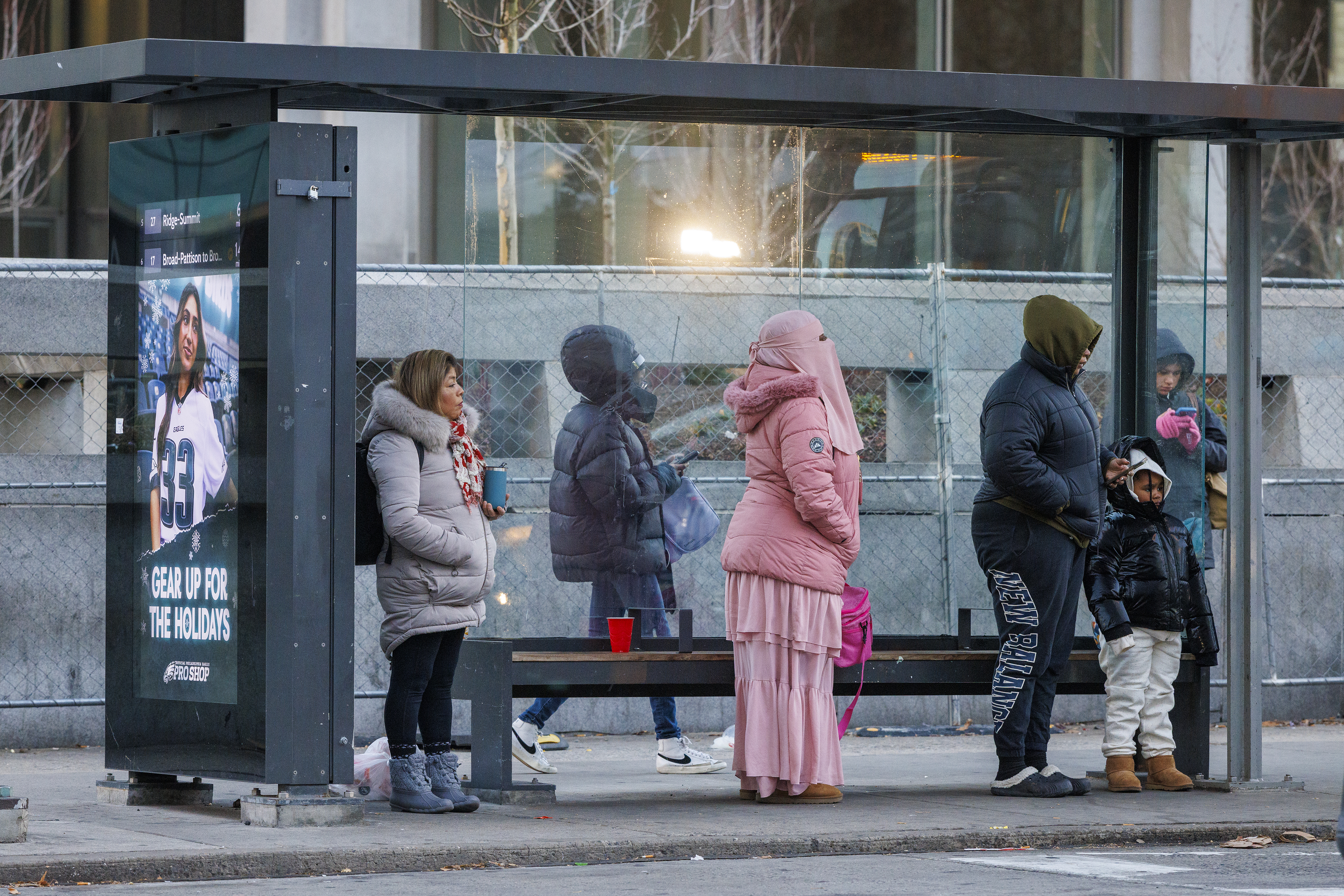 Commuters at a bus stop at 15th Street and JFK Boulevard on a cold December morning in Philadelphia.