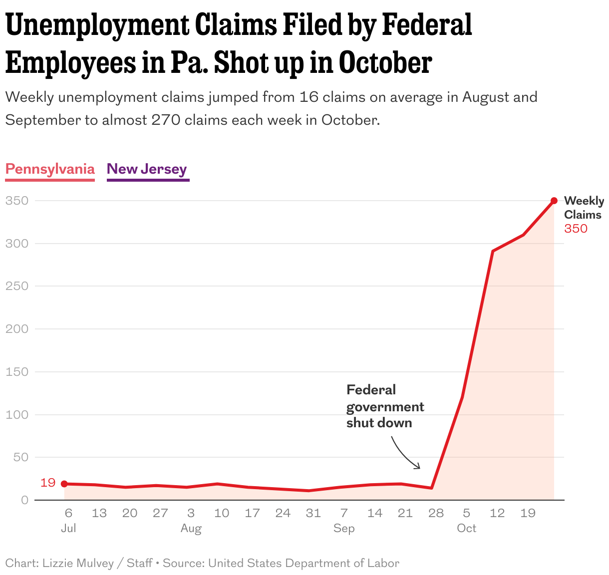 Many federal workers in Pennsylvania and New Jersey filed for unemployment benefits.