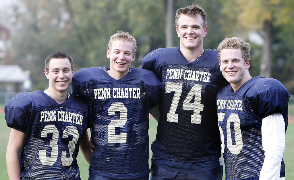 Mike McGlinchey (74), pictured with Penn Charter teammates and fellow Matt Ryan cousins Jake McCain, Pat McCain, and Frank McGlinchey, is now considered one of the NFL’s best tackles.