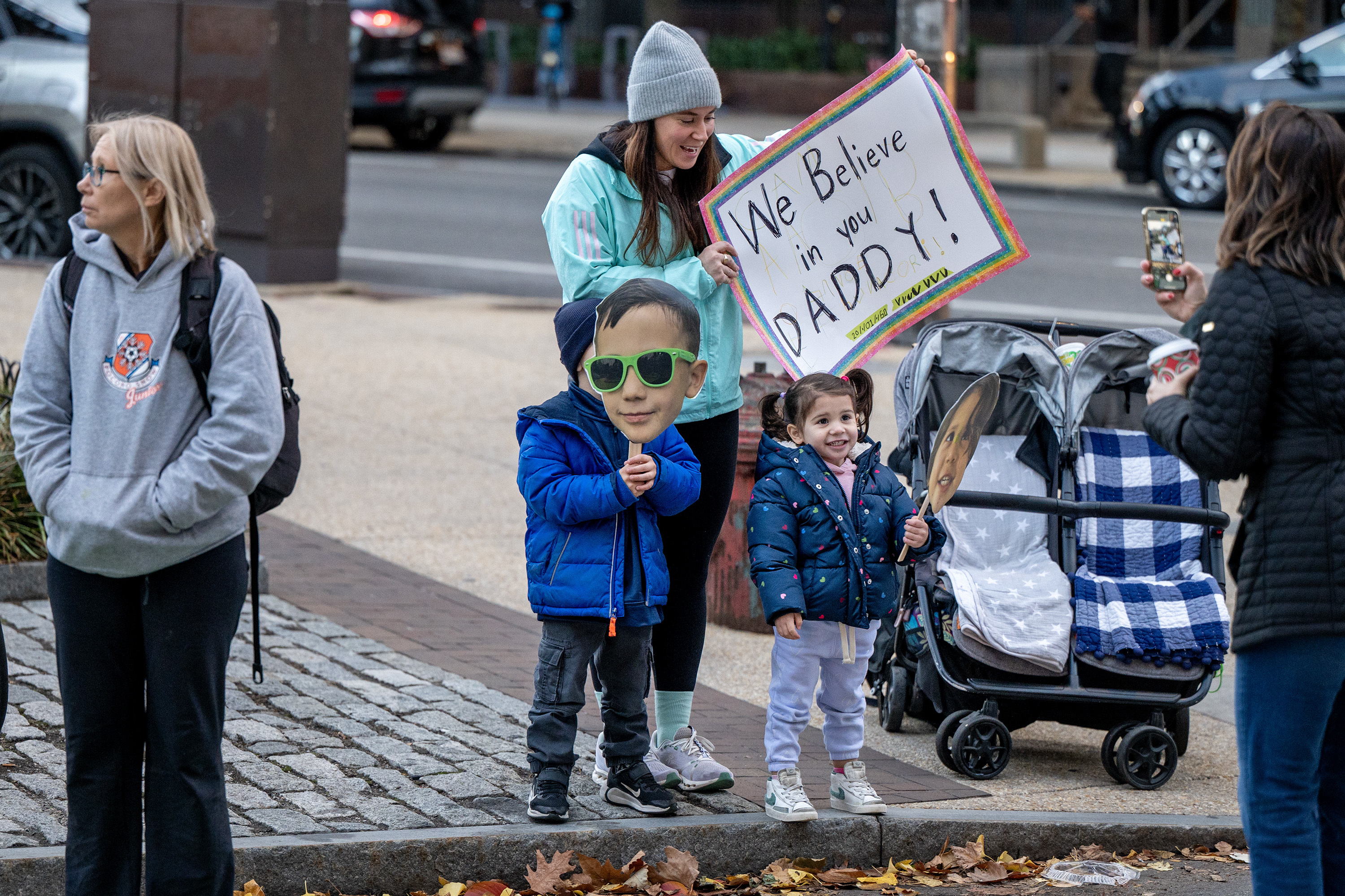 Amanda Carter and her children, Quinn, 3, and Cameron, 5, pose for a photo at 16th and Arch Streets at the start of the 2024 Philadelphia Marathon Sunday, Nov. 24, 2024. The kids had masks with dad Ron Carter’s face. They’re from New York City and this is Ron’s first marathon. Amanda who had done three, says “’m usually the one running.”