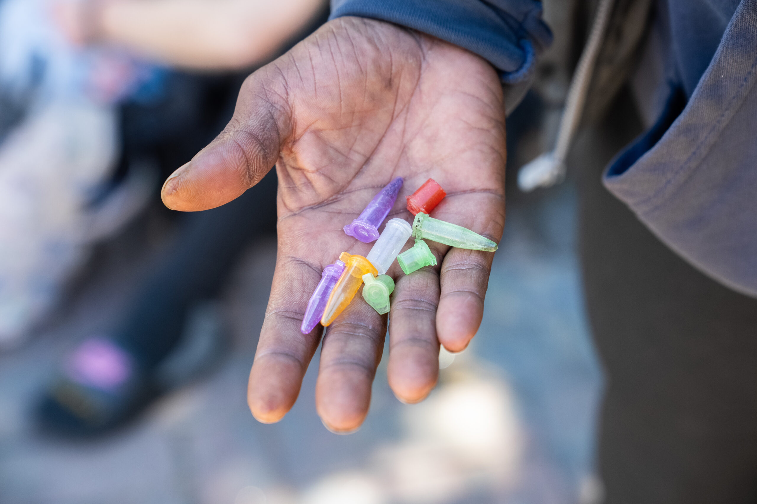 A man who sells drugs holds a collection of empty vials that typically hold meth, crack, and other illicit substances.