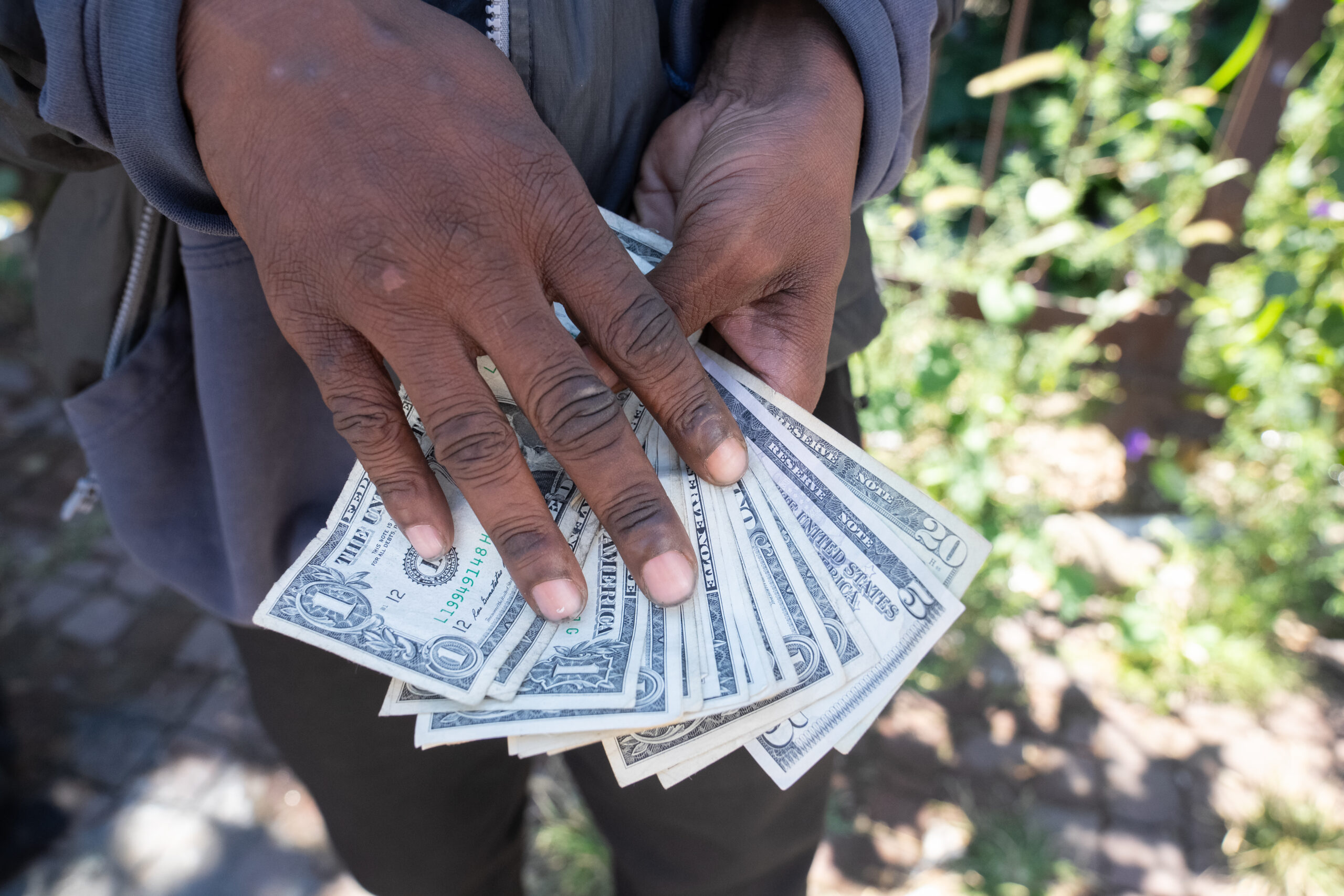 A man fans out the cash he has made on a recent day selling drugs. It’s not much — in part, he said, because there are fewer people in Kensington buying from him.
