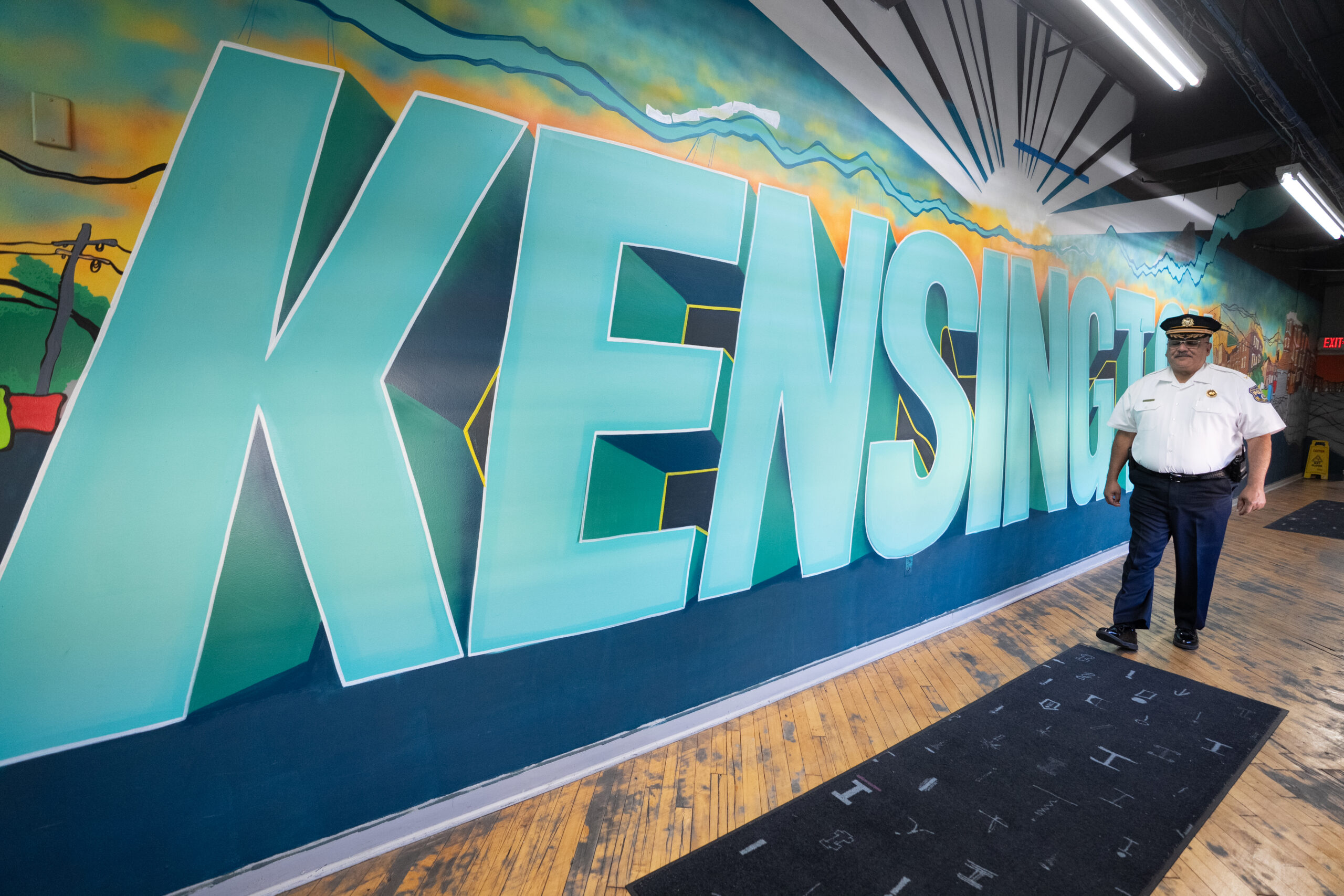 Deputy Commissioner Pedro Rosario walks through the mini police station on Allegheny Avenue.