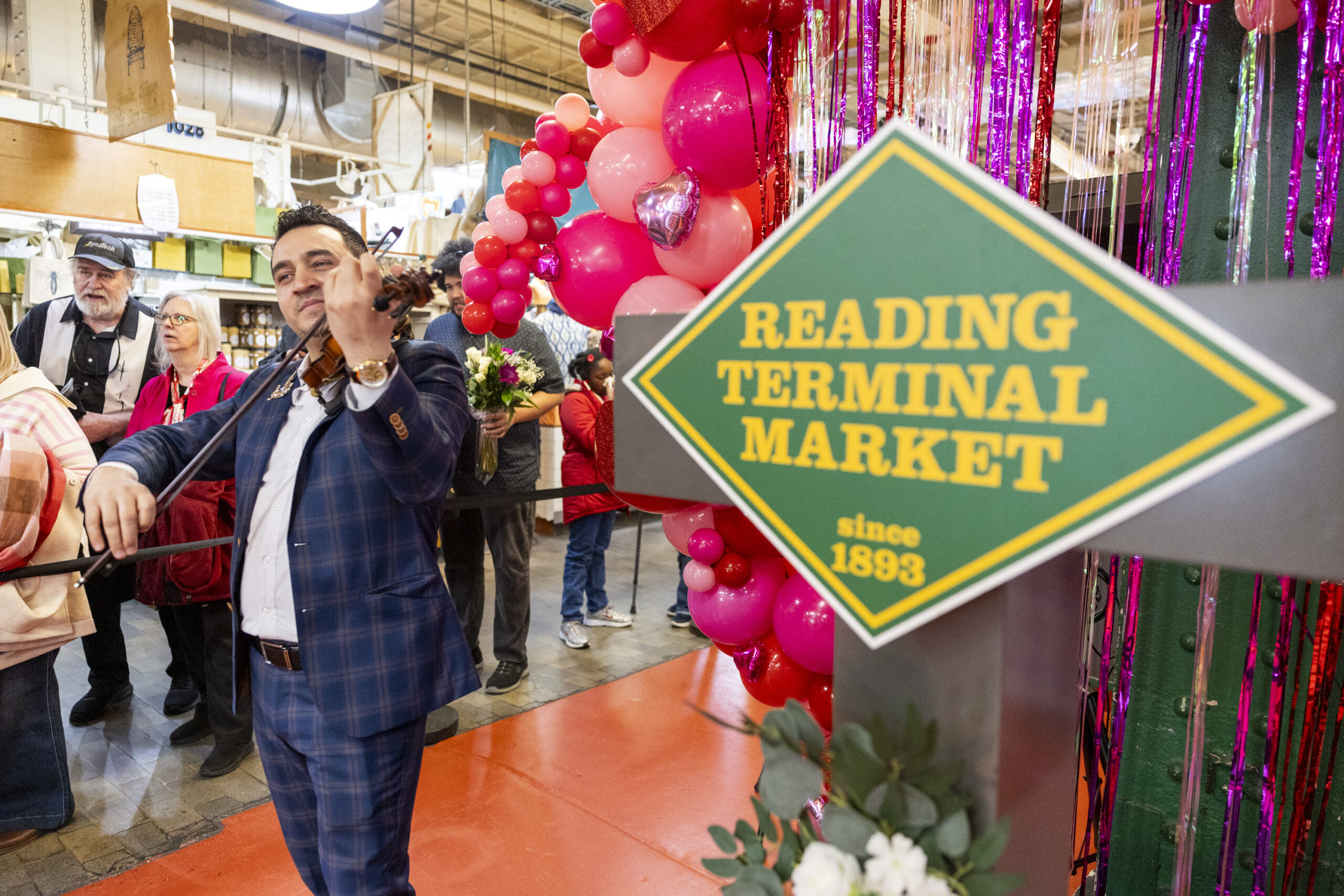 Luigi Nicolae performs some music for families, friends, and guests attending the Reading Terminal Market’s Married at the Market on Valentine’s Day in Philadelphia, Pa., on Saturday, Feb. 14, 2026.