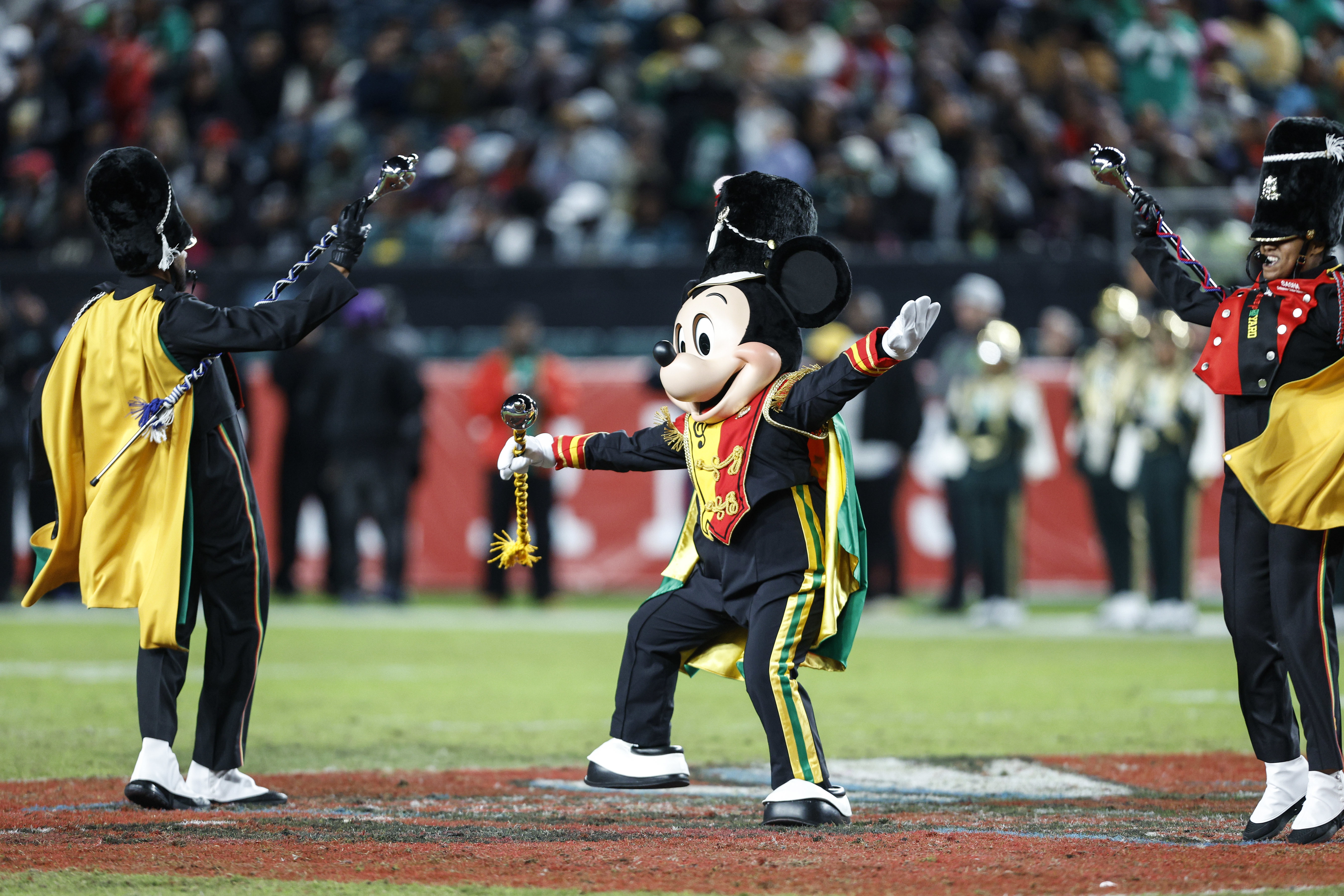 Norfolk State’s drum major dresses as Mickey Mouse during halftime of their game against Delaware State at Lincoln Financial Field on Thursday.