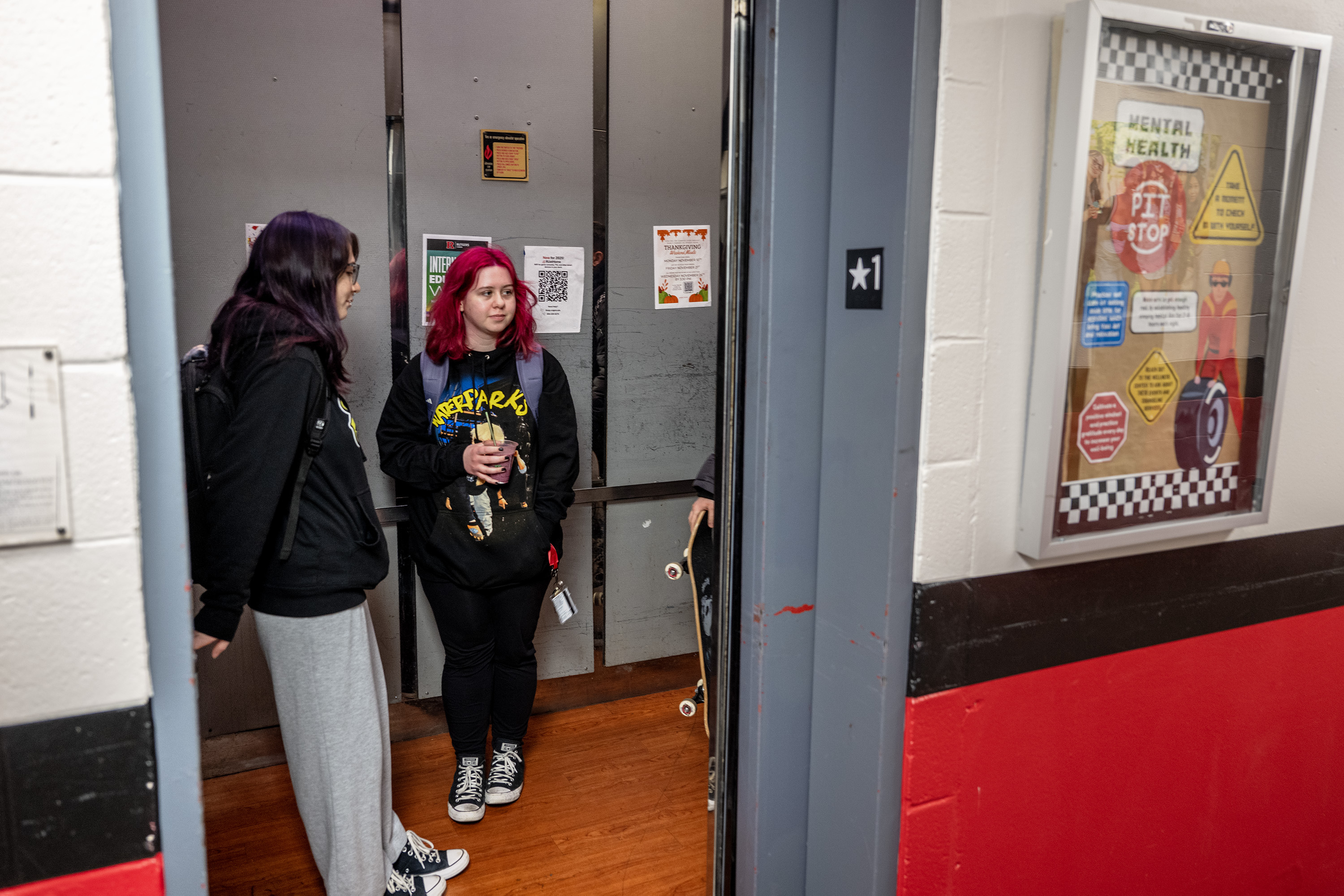 Freshmen Ollie McDermott (left), a psychology major from Buena and Remi Zebedies (right) an art therapy major from Mays Landing take an elevator in their residence hall at Rutgers-Camden.
