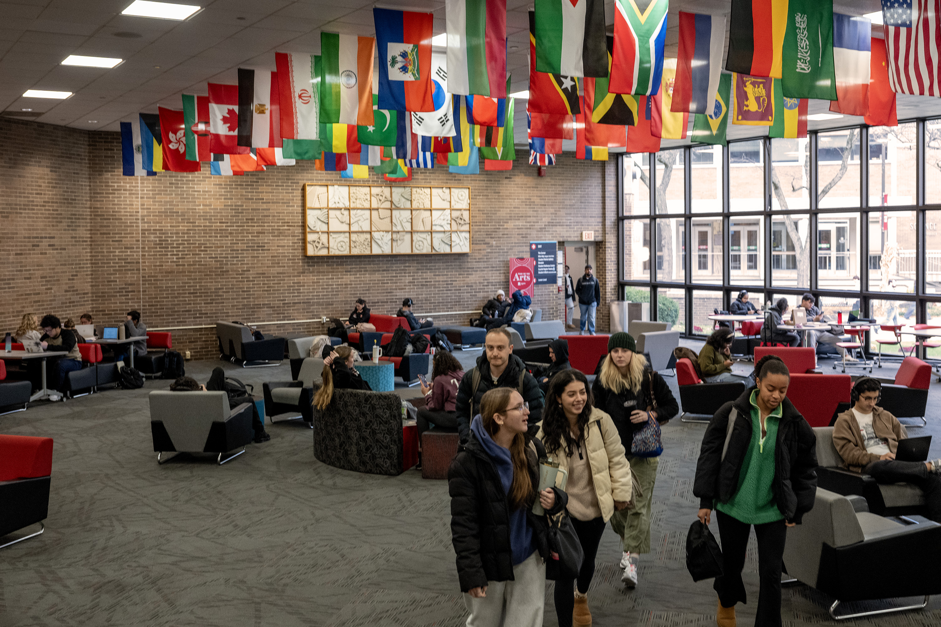 The Campus Center (student center) on the Rutgers-Camden campus with flags of students’ home countries.