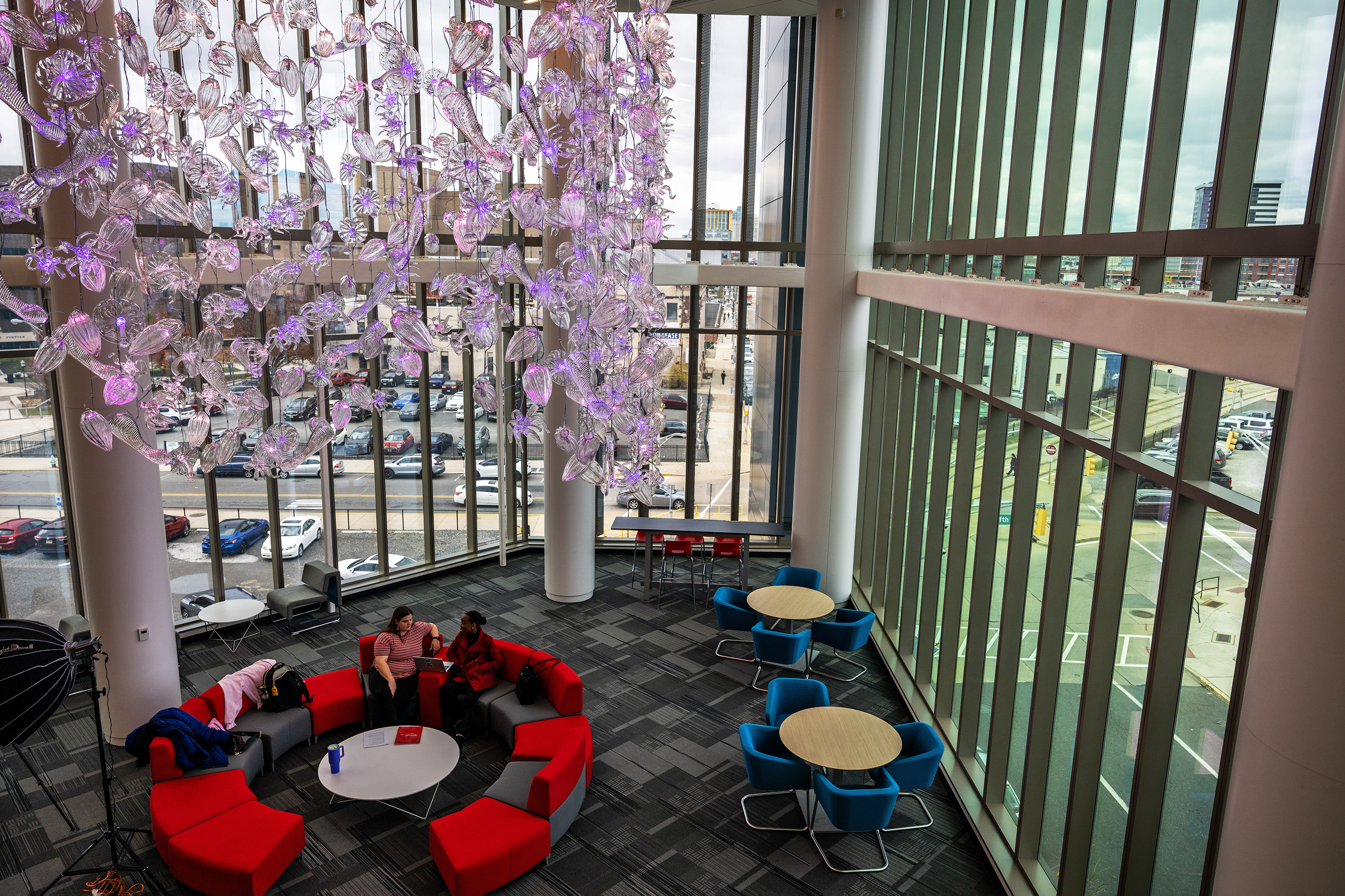 The atrium lobby of the Nursing and Science Building on the Rutgers-Camden campus.