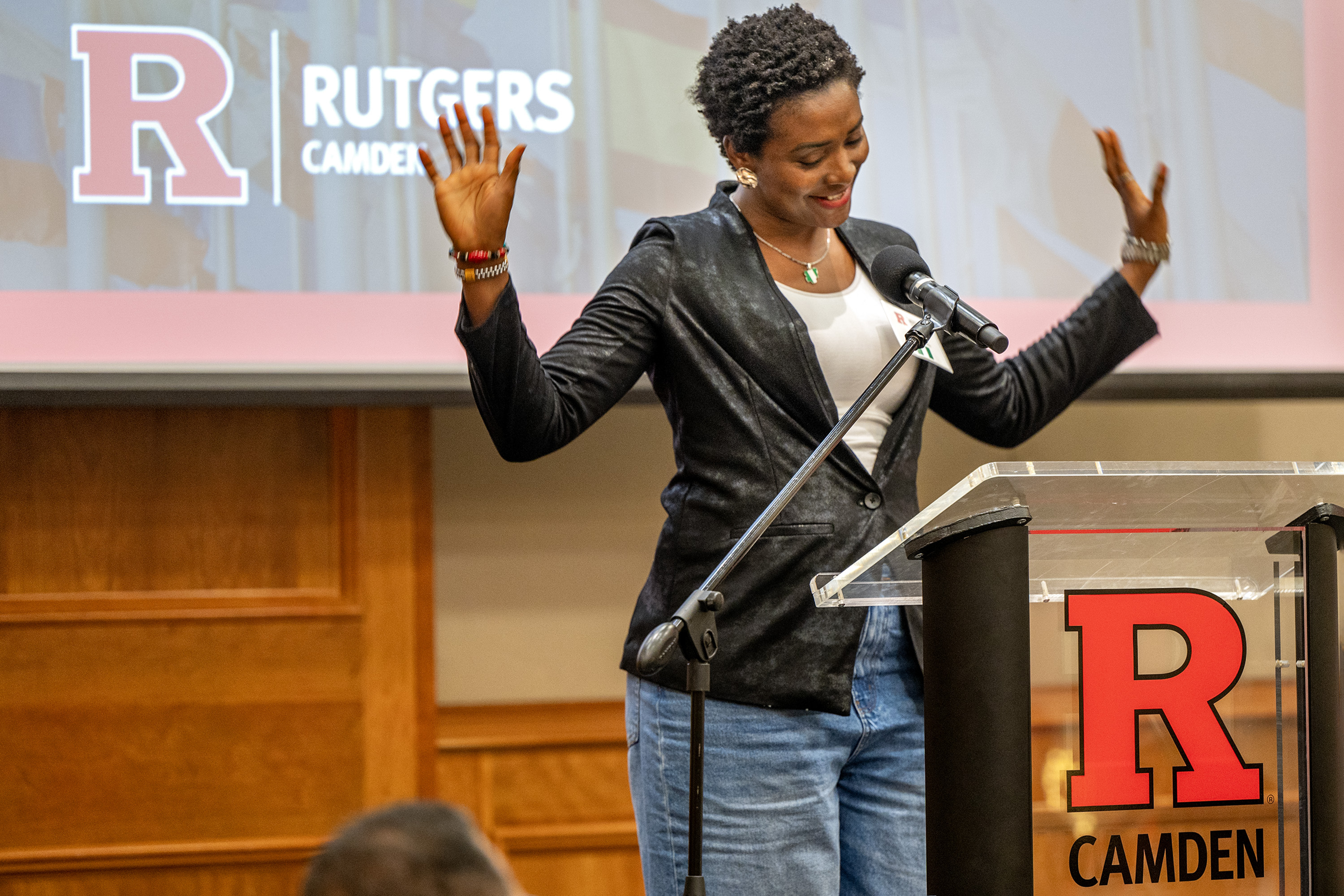 Rutgers-Camden graduate student Funmi Adebajo, from Nigeria, speaks during a luncheon for international students hosted by Chancellor Antonio D. Tillis.