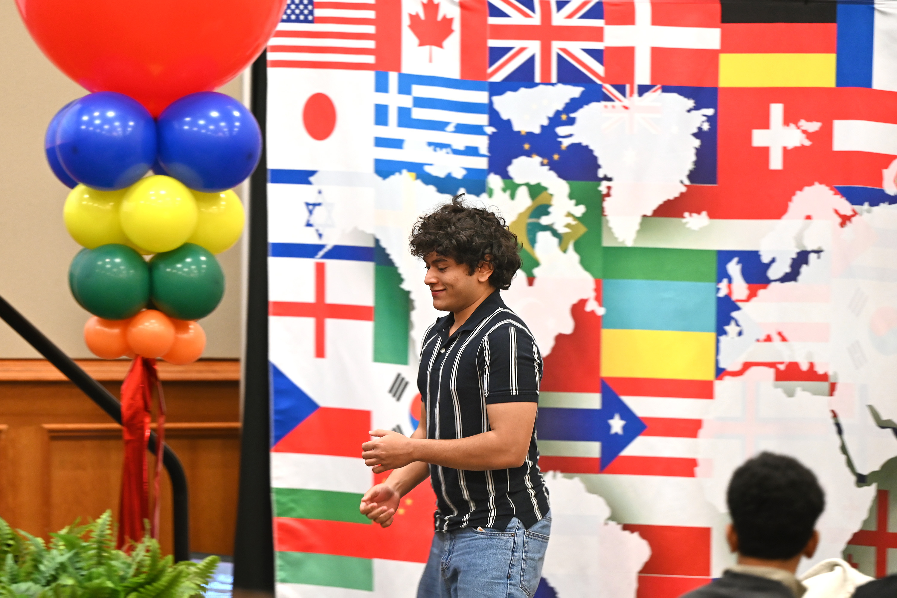 Rutgers-Camden junior Mohammed Al Libaan Kazi, a transfer student from India, walks toward the stage to speak during a luncheon for international students hosted by Chancellor Antonio D. Tillis. International enrollment increased 6% on the campus this year.