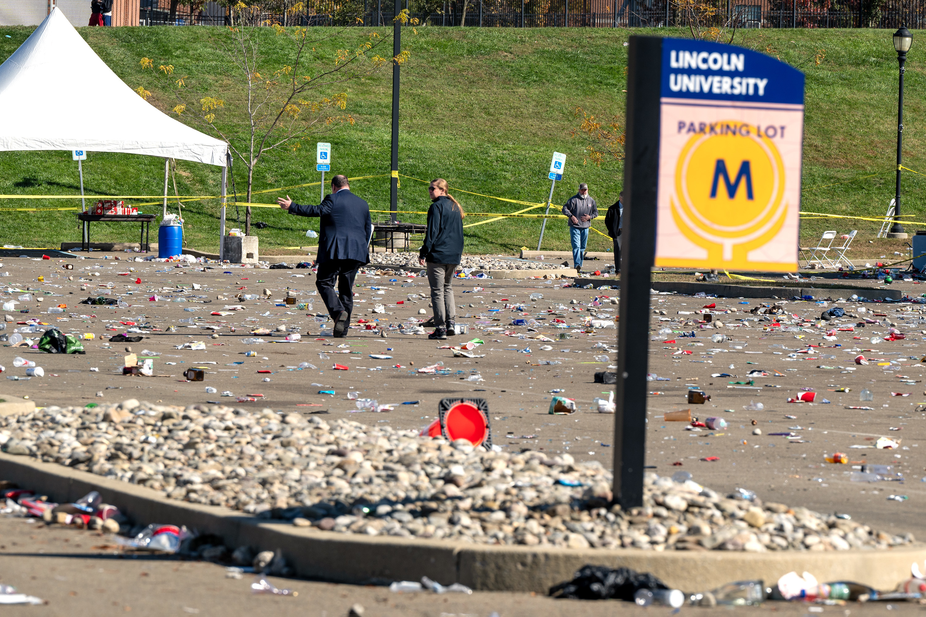 Investigators are on the scene outside Lincoln University’s International Cultural Center (ICC) Sunday, Oct. 26, 2025, where one person was killed and six other people were shot the night before during homecoming weekend celebrations.