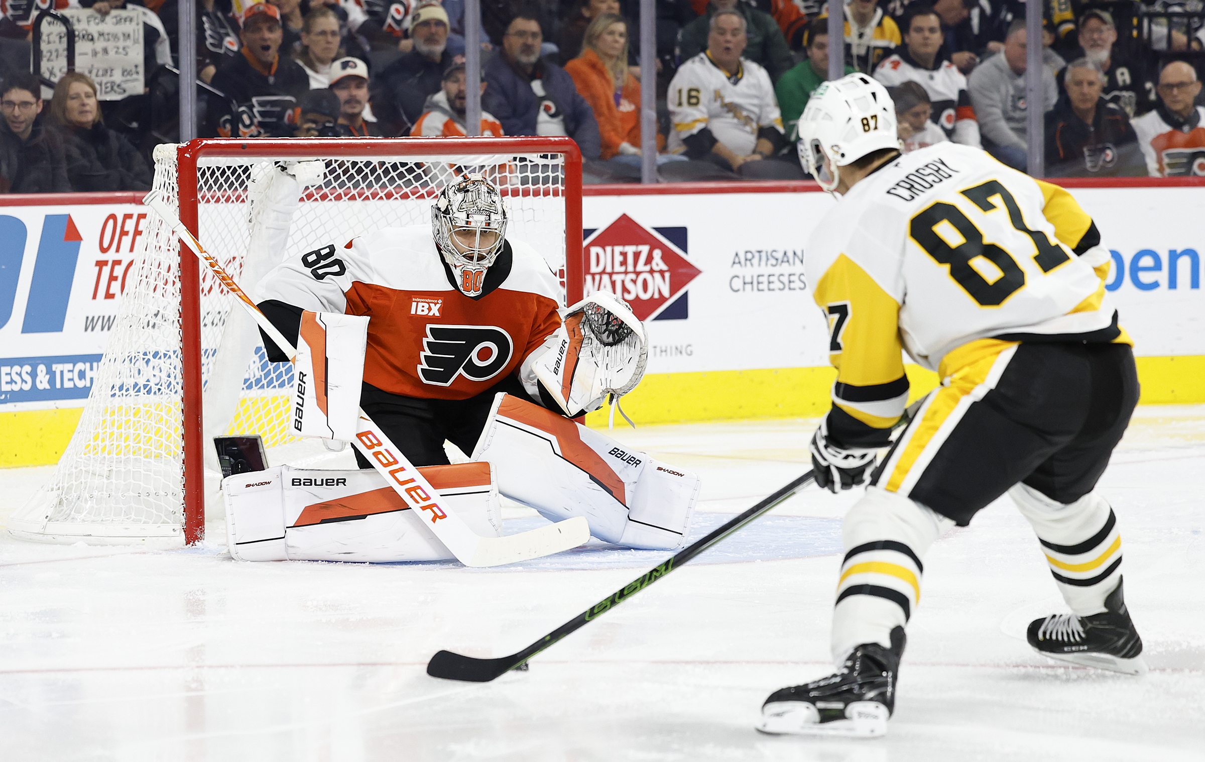 After Cam York missed a shot wide, the Penguins broke out, and Bryan Rust put a shot on goal from the inside of the right faceoff circle. Dan Vladař had a good line of sight on the shot and made the save, but he wasn’t able to control the rebound, and Crosby scored.